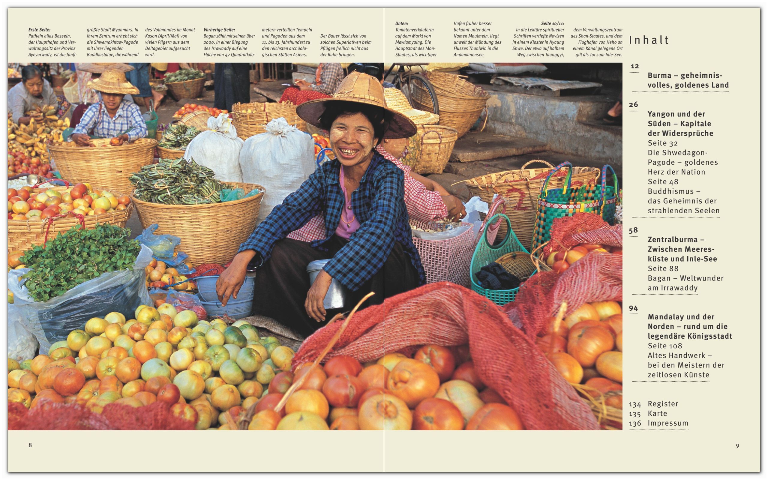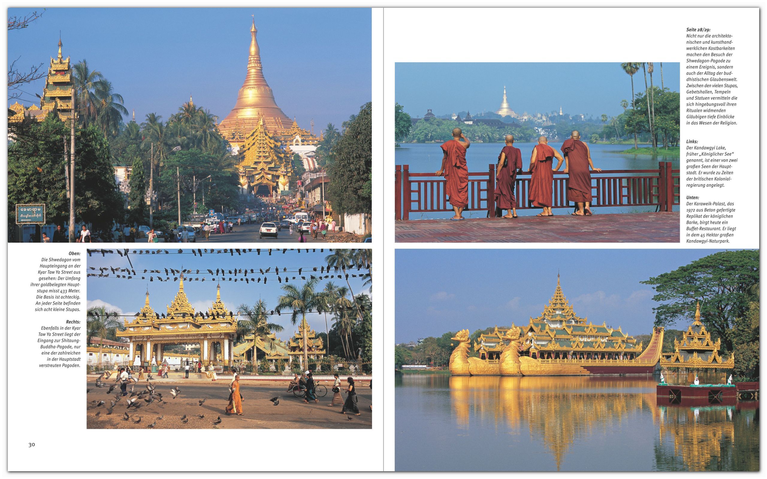 Sattgrüne Reisfelder im Süden, gewaltige Gipfel und dicht bewaldete Hügelrücken im Norden, majestätische Ströme, malerische Seen und palmengesäumte Meeresstrände - das faszinierende Burma lockt nicht nur mit faszinierender landschaftlicher Vielfalt. in den arc...