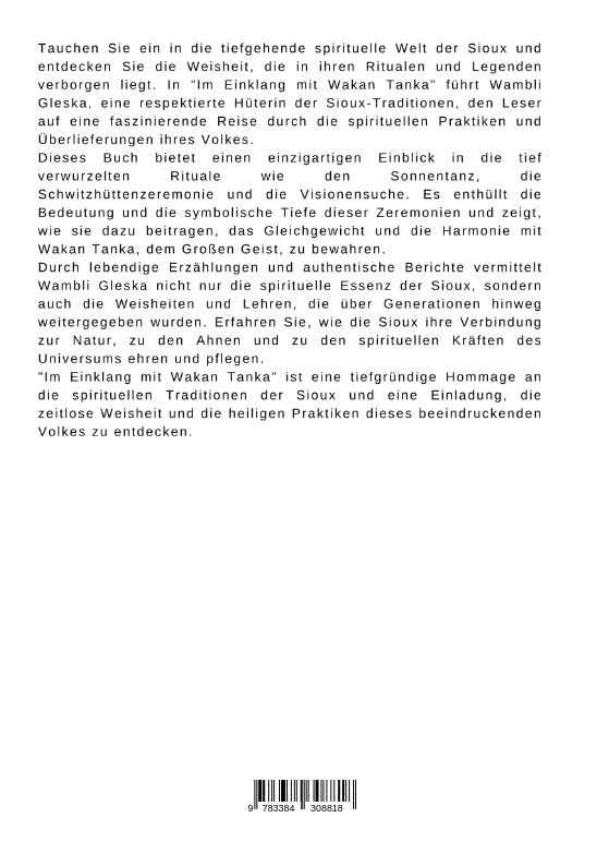 Tauchen Sie ein in die tiefgehende spirituelle Welt der Sioux und entdecken Sie die Weisheit, die in ihren Ritualen und Legenden verborgen liegt. In "Im Einklang mit Wakan Tanka" führt Wambli Gleska, eine respektierte Hüterin der Sioux-Traditionen, den Leser a...