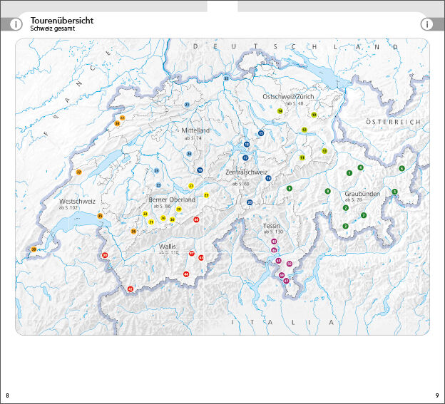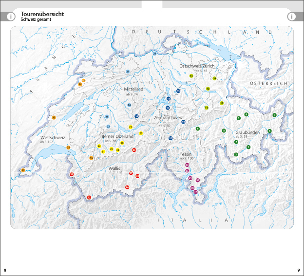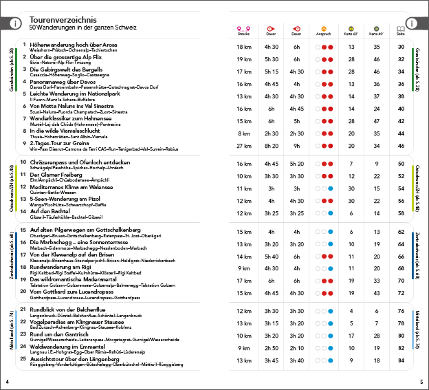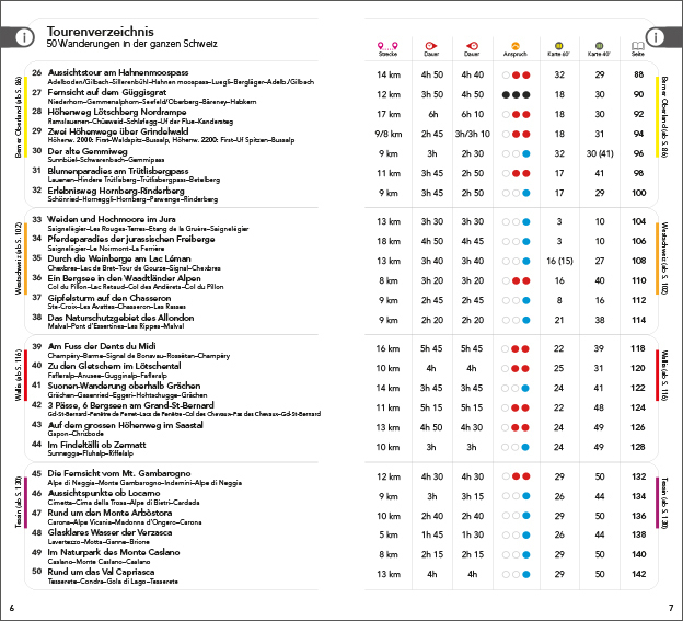 50 Wanderrouten mit Fotos, Routenkarten und Höhenprofile, Anfahrtsbeschreibung zum Ausgangspunkt, Zeit der Wanderung, Schwierigkeitsgrad, Hütten und Bergrestaurants, Markierung, Blick auf Wetterbedingungen und Geologie.