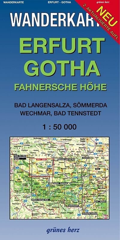 Thüringens Kernland mit der Landeshauptstadt Erfurt, der Residenzstadt Gotha, das fruchtbare Unstruttal sowie die vom Obstanbau geprägte Fahnersche Höhe bilden den Mittelpunkt der Karte. Der Blattschnitt reicht vom Baumkronenpfad im Nationalpark Hainich und Ta...