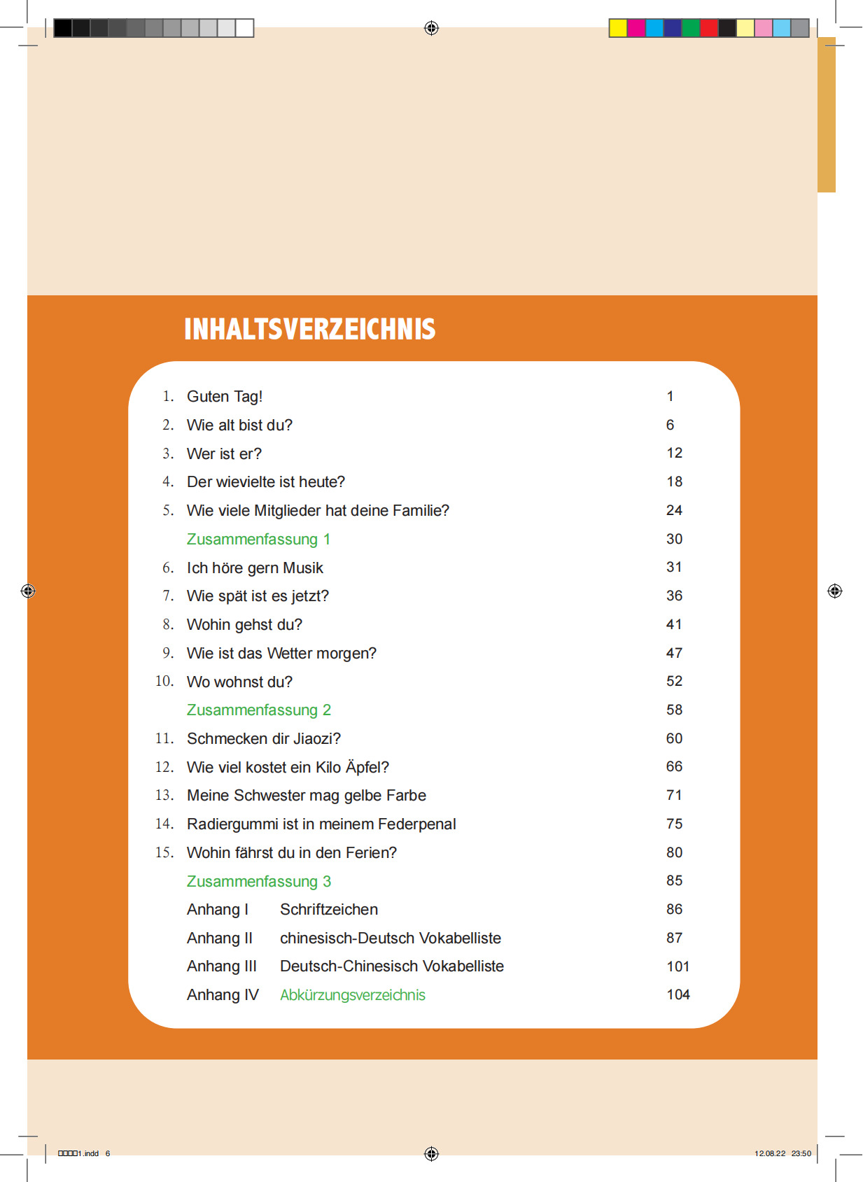 Guten Tag! 1 2. Wie alt bist du? 6 3. Wer ist er? 12 4. Der wievielte ist heute? 18 5. Wie viele Mitglieder hat deine Familie? 24 Zusammenfassung I 30 6. Ich höre gern Musik 31 7. Wie spät ist es jetzt? 36 8. Wohin gehst du? 41 9. Wie ist das Wetter morgen?...