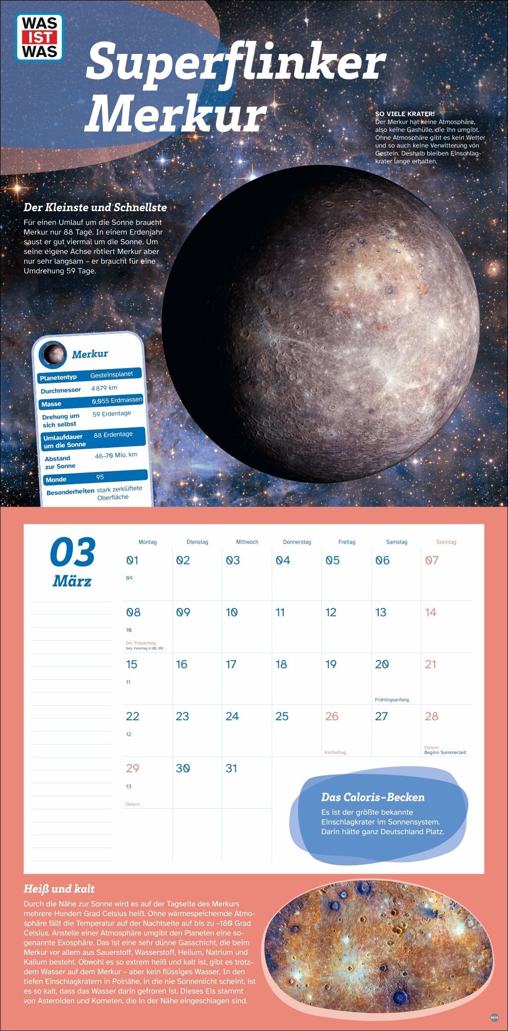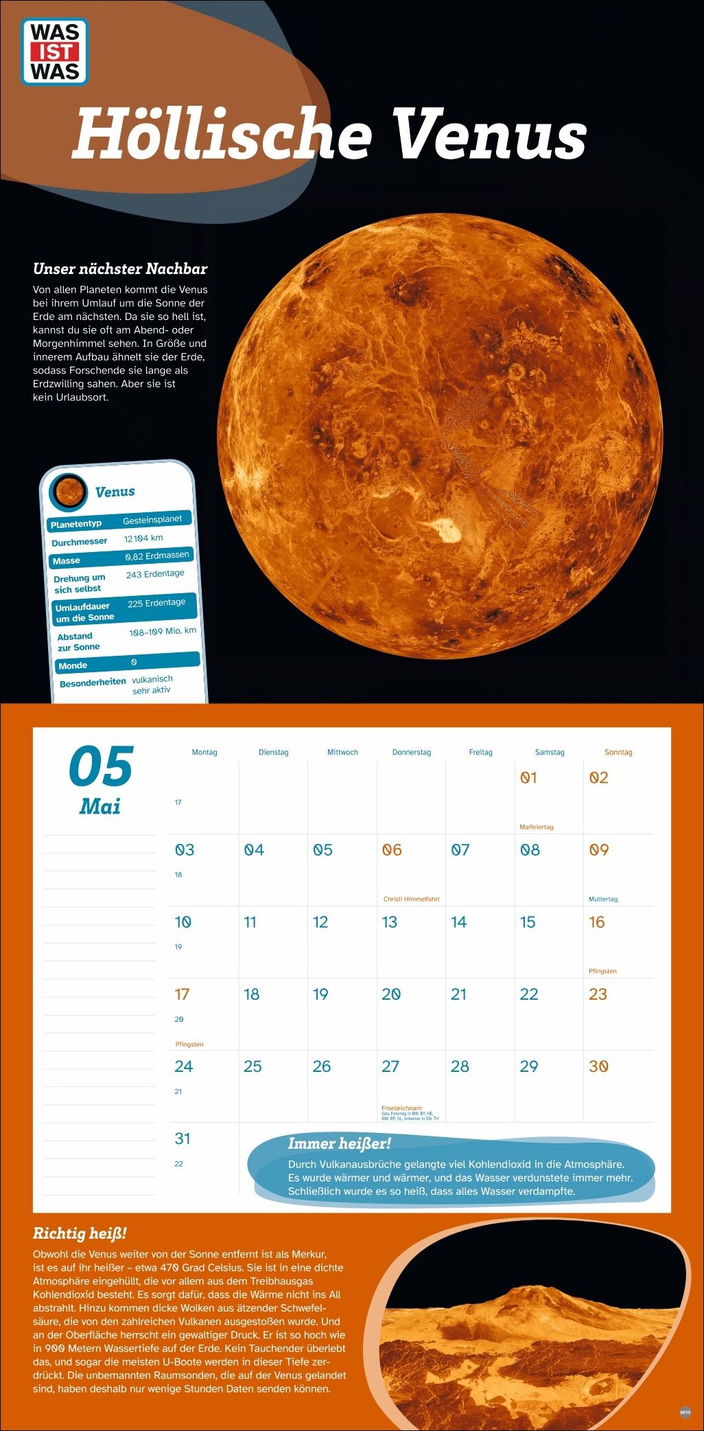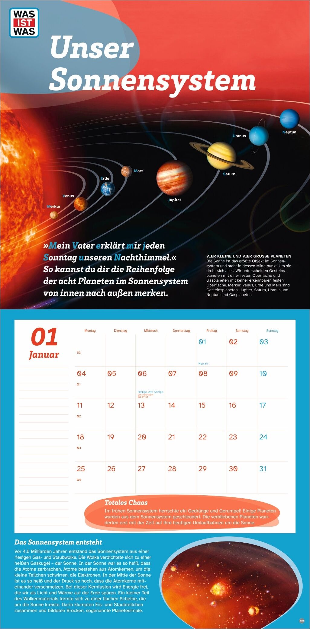 - Altersgerecht vermitteltes Wissen für zukünftige Weltall-Expert:innen: der Kinderzimmer-Wandkalender von WAS IST WAS - Zu Hause im All: Monat für Monat neue faszinierende Fakten über die Milchstraße, unser Sonnensystem und Planeten für neugierige Weltraumfor...