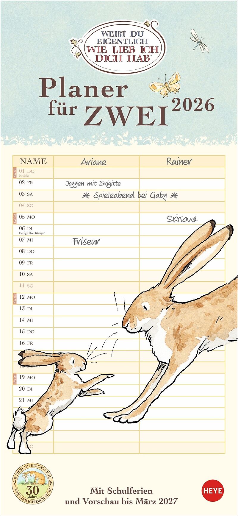 Ein Wandkalender voller Liebe: Der Partnerplaner mit Zeichnungen und Zitaten aus dem berühmten Buch von Sam McBratney und Anita Jeram - Weißt du eigentlich, wie lieb ich dich hab? der Paarkalender 2026 zaubert Monat für Monat ein Lächeln ins Gesicht und biet...