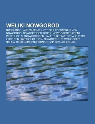 Quelle: Wikipedia. Seiten: 23. Kapitel: Russlands Jahrtausend, Liste der Possadniks von Nowgorod, Nowgoroder Kodex, Nowgoroder Kreml, Peterhof, Altnowgoroder Dialekt, Bronzetür aus Plock, Liste der Erzbischöfe von Nowgorod, Nowgoroder Schra, Birkenrindenurkund...