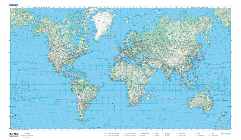 Welt physikalisch Poster, Massstab: 1:50 000 000 Format: 87,5 x 51 cm Sprachen: Karte: Deutsch Legende: Deutsch