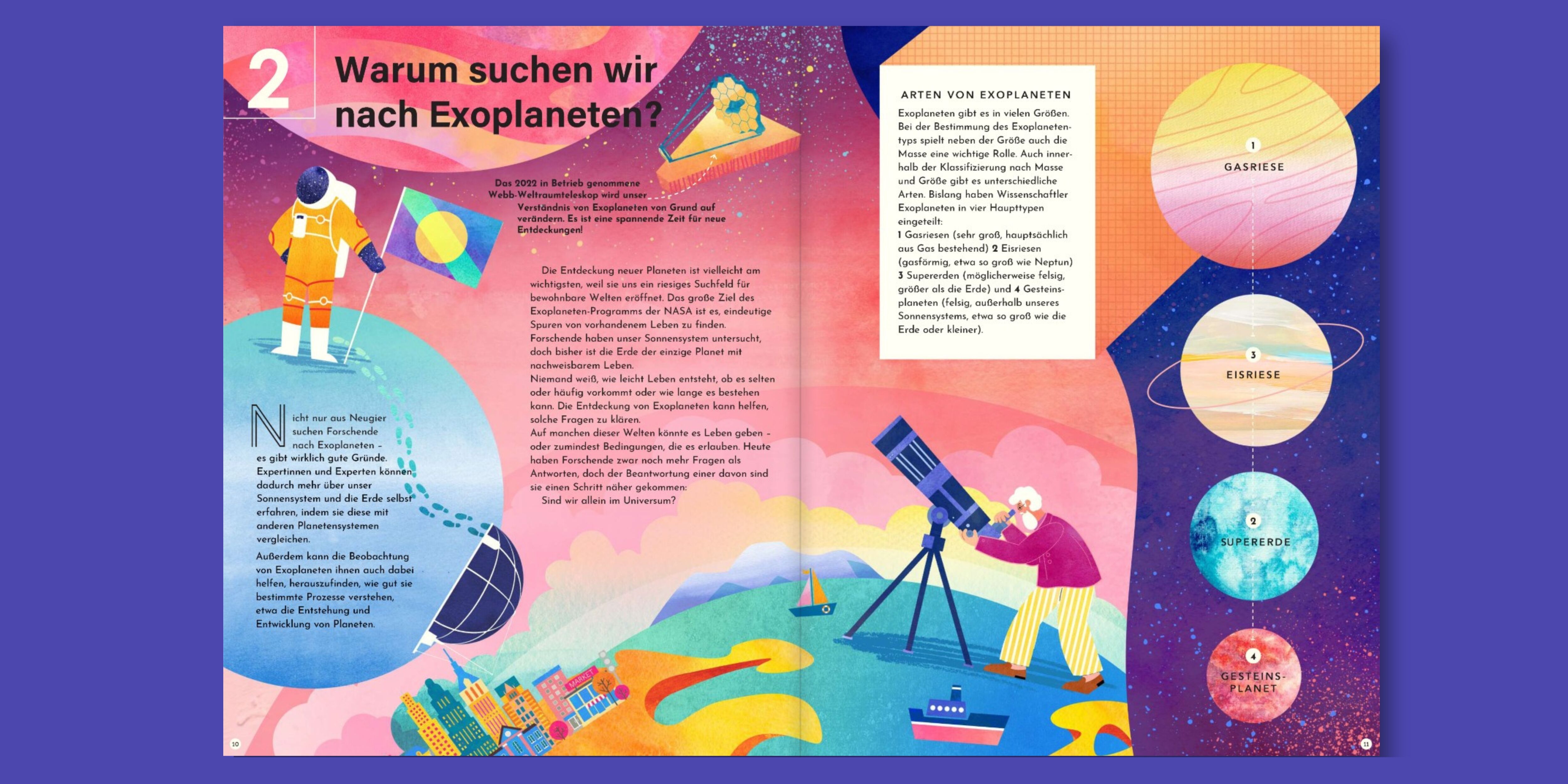 DIE SPEKTAKULÄREN WEITEN DES UNIVERSUMS Exoplaneten sind Planeten, die außerhalb unseres Sonnensystems liegen. Über 6000 von ihnen hat die NASA bisher bestätigt, und es werden immer mehr! In diesem einzigartigen Kindersachbuch erfahren wir, warum Forscher:inne...DIE SPEKTAKULÄREN WEITEN DES UNIVERSUMS