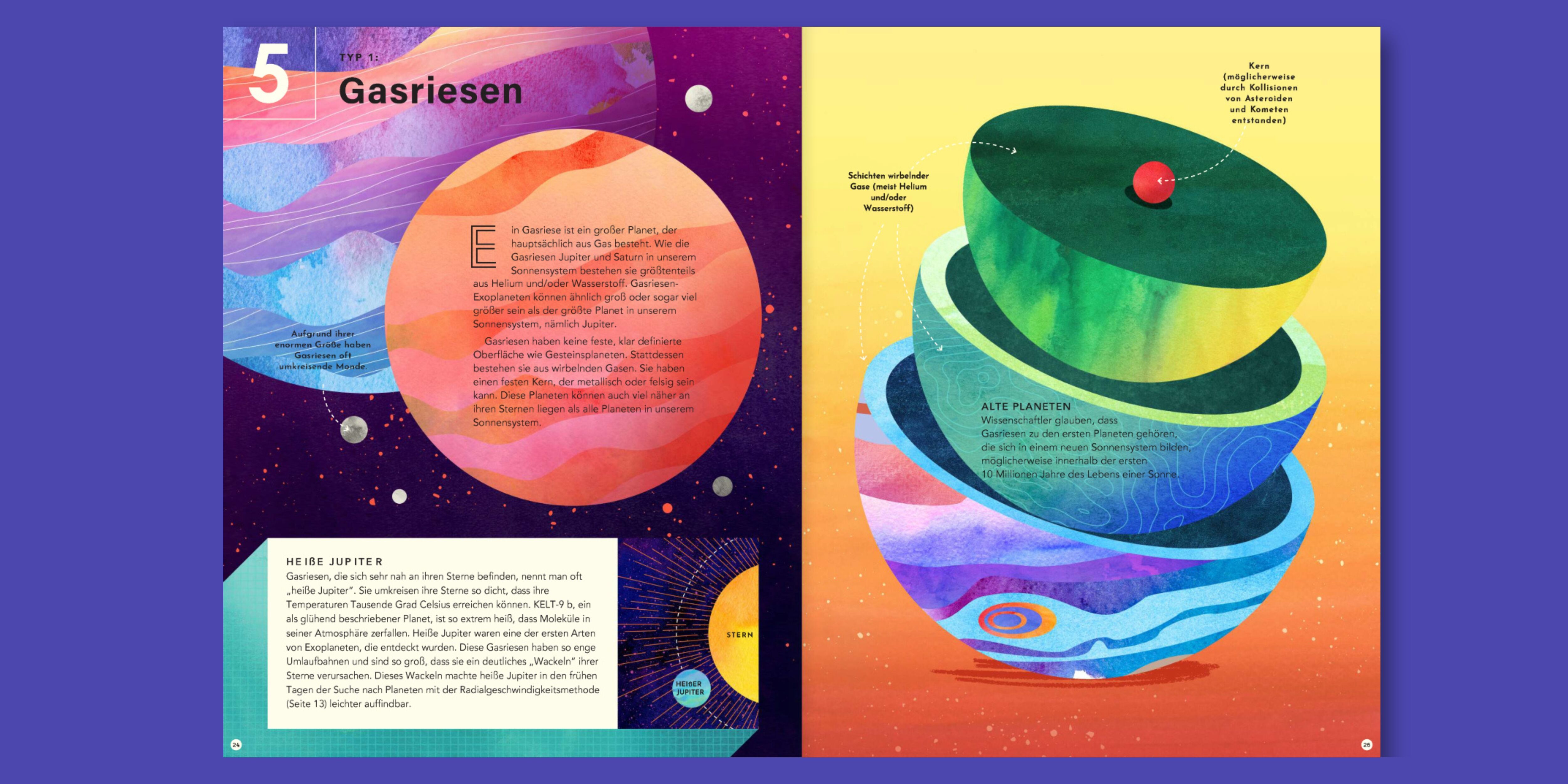 DIE SPEKTAKULÄREN WEITEN DES UNIVERSUMS Exoplaneten sind Planeten, die außerhalb unseres Sonnensystems liegen. Über 6000 von ihnen hat die NASA bisher bestätigt, und es werden immer mehr! In diesem einzigartigen Kindersachbuch erfahren wir, warum Forscher:innen nach ihnen suchen, mit welchen Methoden man sie aufspürt und wo außerirdisches Leben existieren könnte. Spektakulär farbenfrohe Illustrationen und spannende Kurztexte vermitteln hochaktuelle Forschungsergebnisse. Mit Steckbriefen, die einen Überblick über die berühmtesten Exoplaneten und ihre Eigenschaften geben. - mit Lichtgeschwindigkeit voraus: eine Expedition zu weit entfernten Planeten - das erste Kindersachbuch über Exoplaneten - von Gasriesen, Wasserwelten, Diamantkrusten und Supererden - mit Planetensteckbriefen und den modernsten Entdeckungsmethoden - für Weltraumentdecker und Entdeckerinnen ab 10 Jahren ÜBER DIE VIELFALT DER EXOPLANETEN Dieses Buch führt uns tiefer in die unendlichen Weiten des Weltalls als je zuvor. Dorthin, wo es Planeten aus purem Diamant gibt, Planeten mit vier verschiedenen Sonnen und pinken Sonnenuntergängen, und Himmelskörper, die so heiß sind, dass sie buchstäblich verdampfen. Wir entdecken Supererden, Lava-Planeten und Welten mit Temperaturen von bis zu minus 230 Grad Celsius. Selten hat sich ein Forschungsgebiet so rasant entwickelt wie das der extrasolaren Planeten. Noch vor etwa drei Jahrzehnten war man nicht einmal sicher, ob es außerhalb unseres Sonnensystems überhaupt Planeten gibt – denn Exoplaneten lassen sich nur selten direkt beobachten. Hier erfahren wir mehr über die Methoden, die es uns möglich machen, ihre Existenz zu beweisen und mehr über sie zu erfahren. Und wir gehen der Frage nach, ob es auf einem von ihnen Leben geben könnte. Zusätzlich werden zahlreiche der berühmtesten Exoplaneten in kurzen Steckbriefen vorgestellt: von den heißesten bis zu den sonderbarsten Welten des Universums. WUNDERSCHÖN ILLUSTRIERTES WISSEN Autorin Wendy Bjazevich verpackt komplexe Wissenschaft in spannende Kurztexte, die das Wichtigste zum Thema altersgerecht erklären. Dazu laden die leuchtenden Illustrationen und Schaubilder des Illustrators David Miles ein, sich in den Weiten des Universums zu verlieren. Dieses Kindersachbuch ist die perfekte Ergänzung zum allgemeinen Weltraumatlas und begeistert alle, die von den Geheimnissen des Weltalls nicht genug bekommen können. Aus dem Englischen von Nina Goldt.