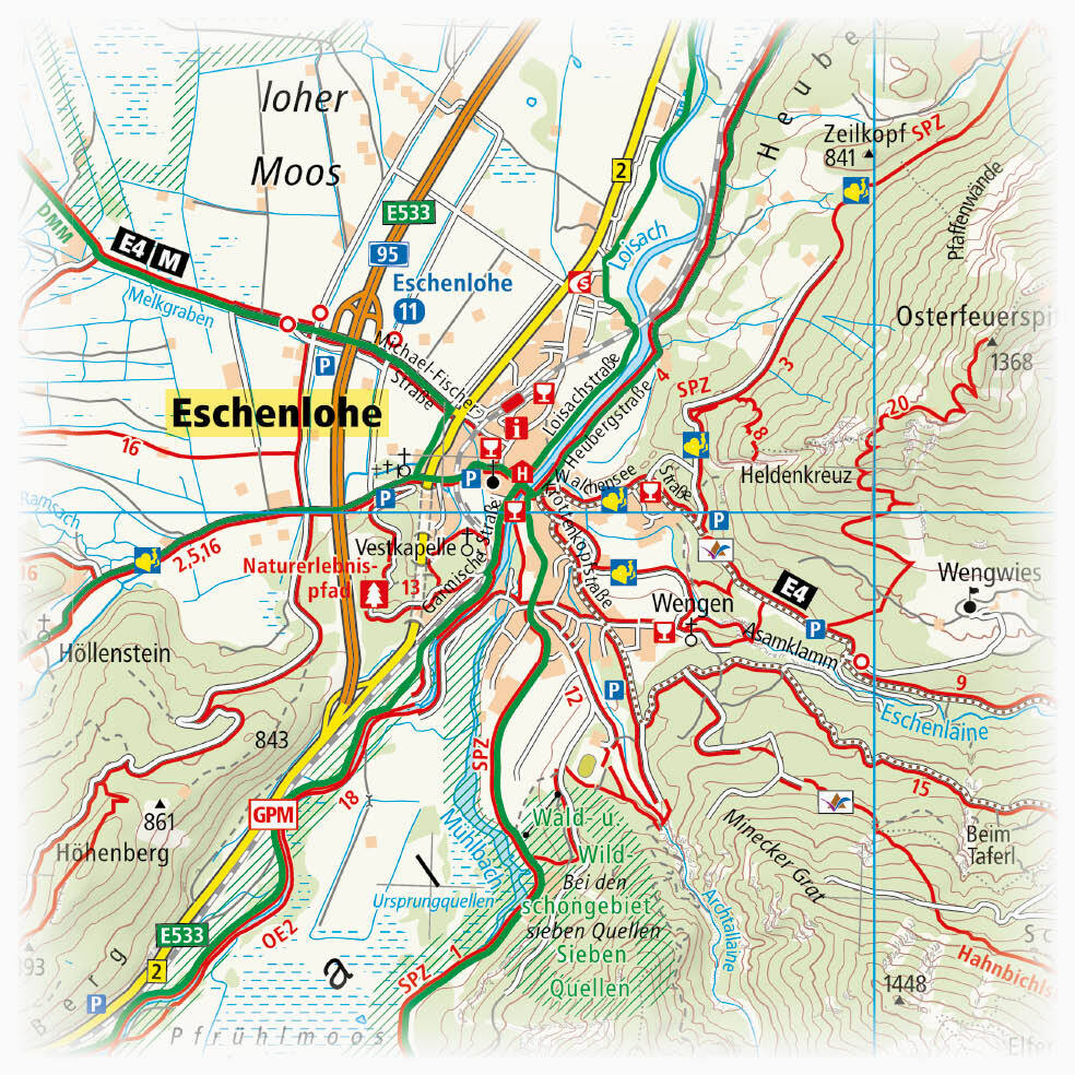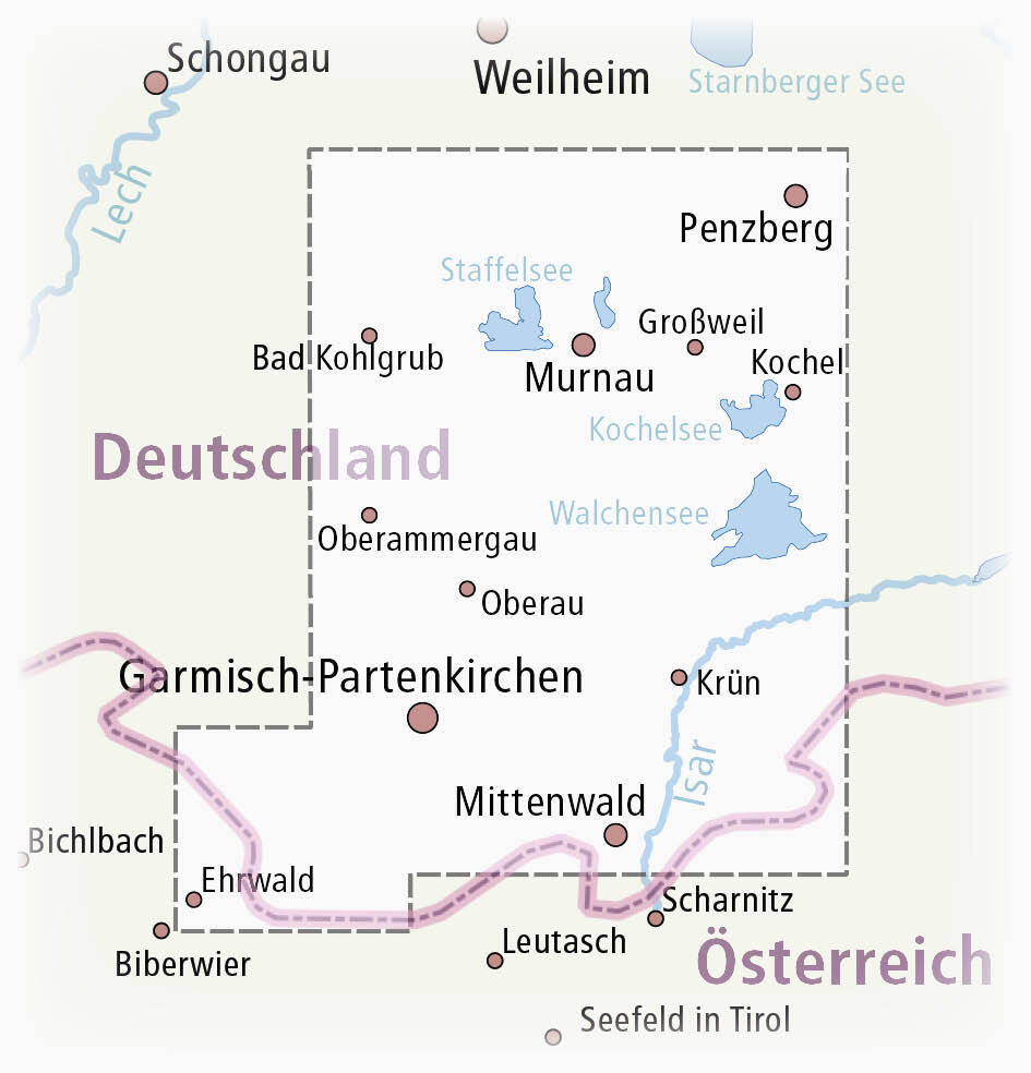 Der Kartenausschnitt bietet im nördlichen Teil v. a. Radwanderwege durchs Bayerische Oberland mit seinen Seen (Kochel-, Walchen-, Staffelsee). Ein weiterer Fernradweg führt entlang der Isar. Im Werdenfelser Land mit seinen Gebirgen sind konditionsfordernde Wan...