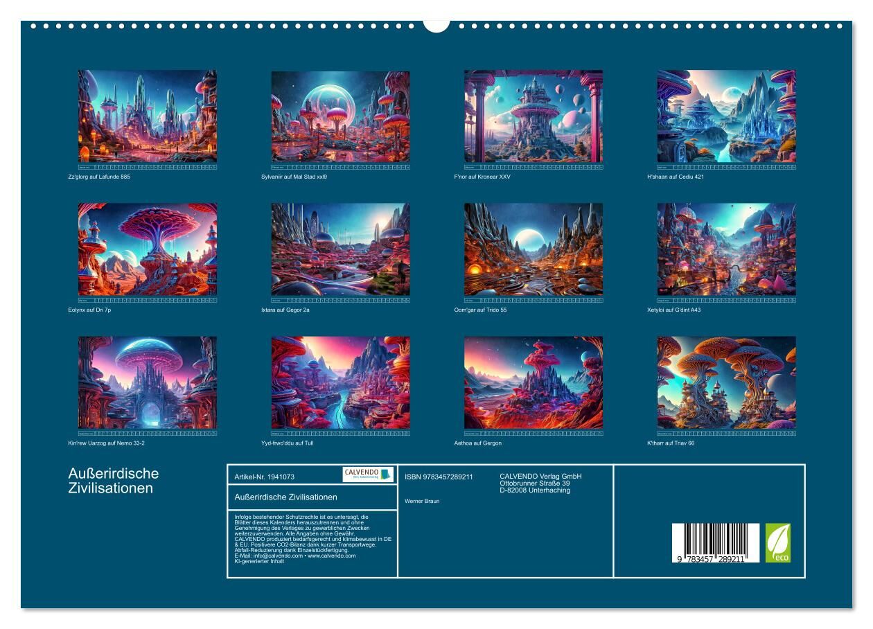 Entdecken sie die Faszinationen außerirdischer Zivilisationen! Dieser einzigartige Kalender präsentiert Ihnen zwölf atemberaubende Bilder, erschaffen mit Hilfe von künstlicher Intelligenz. Jedes Monatsblatt enthüllt eine fremde Siedlung, eingebettet in eine Um...
