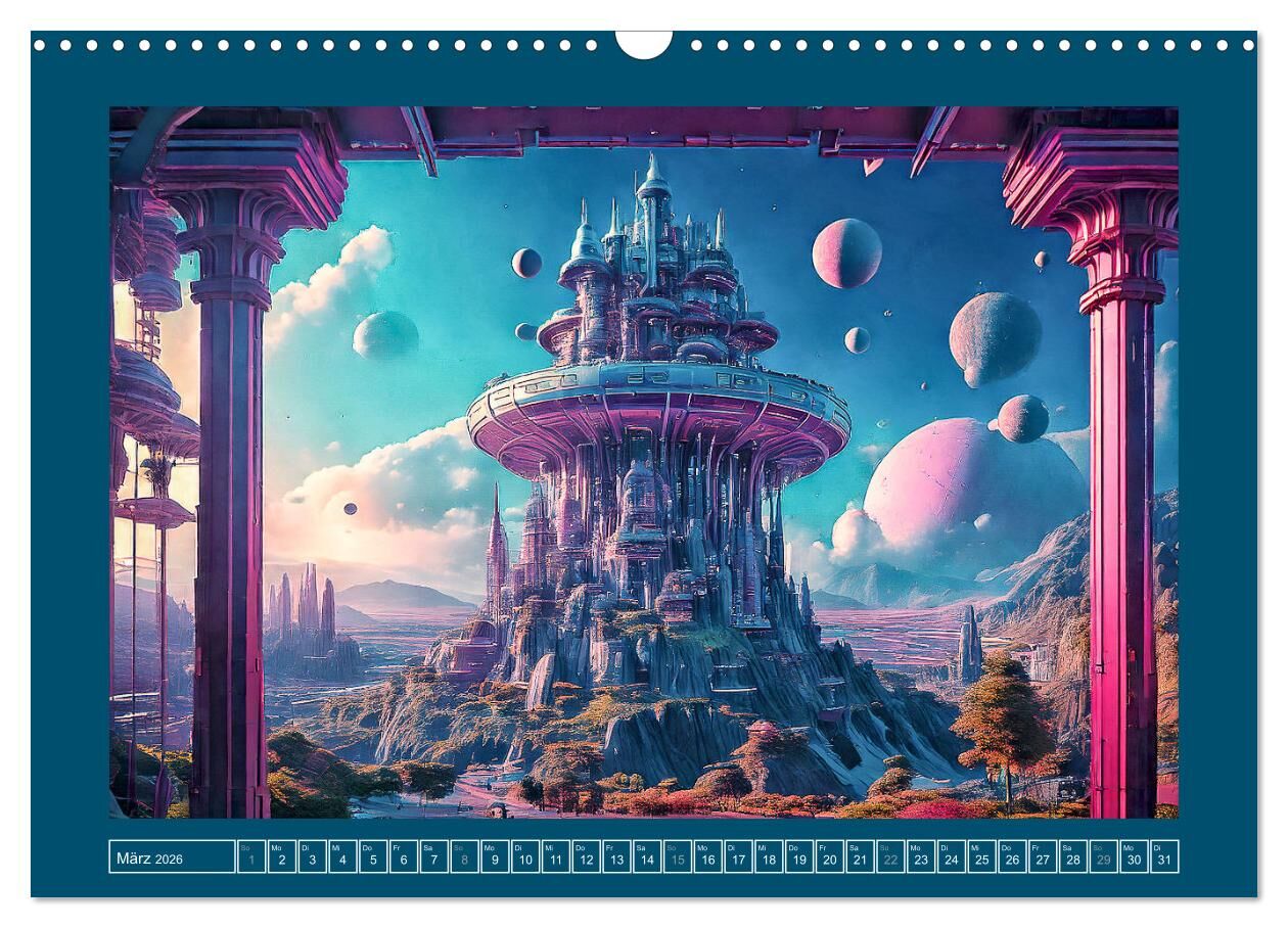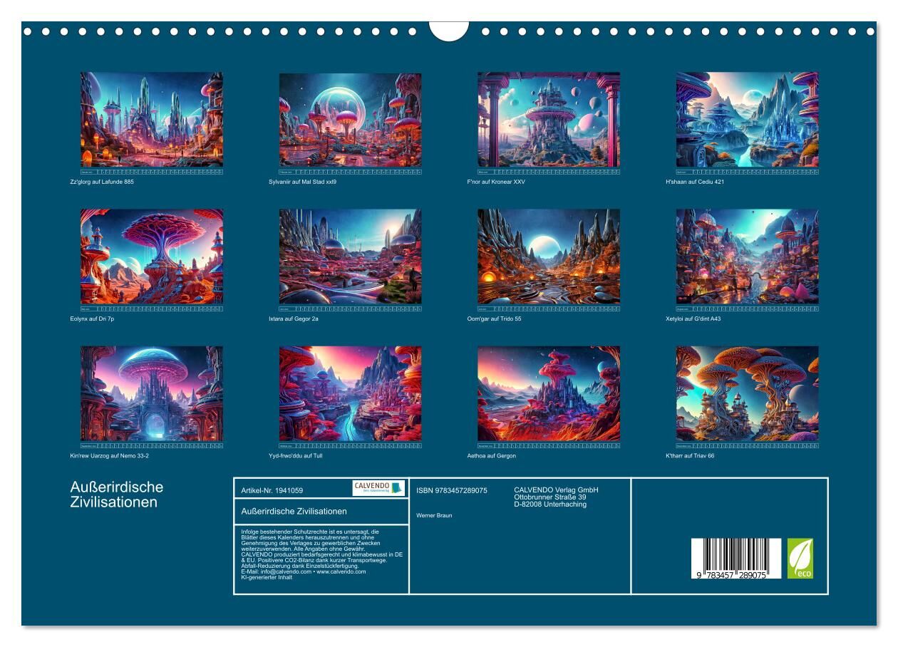 Entdecken sie die Faszinationen außerirdischer Zivilisationen! Dieser einzigartige Kalender präsentiert Ihnen zwölf atemberaubende Bilder, erschaffen mit Hilfe von künstlicher Intelligenz. Jedes Monatsblatt enthüllt eine fremde Siedlung, eingebettet in eine Um...