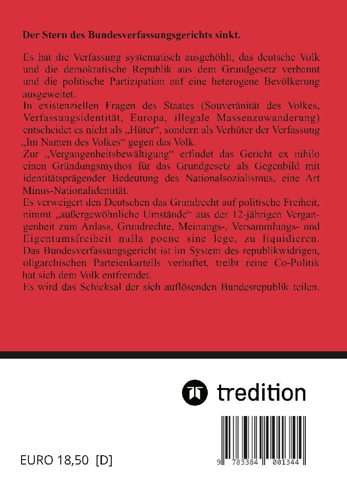 Der Stern des Bundesverfassungsgerichts sinkt. Es hat die Verfassung systematisch ausgehöhlt, das deutsche Volk und die demokratische Republik aus dem Grundgesetz verbannt und die politische Partizipation auf eine heterogene Bevölkerung ausgeweitet. In existen...