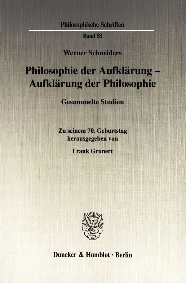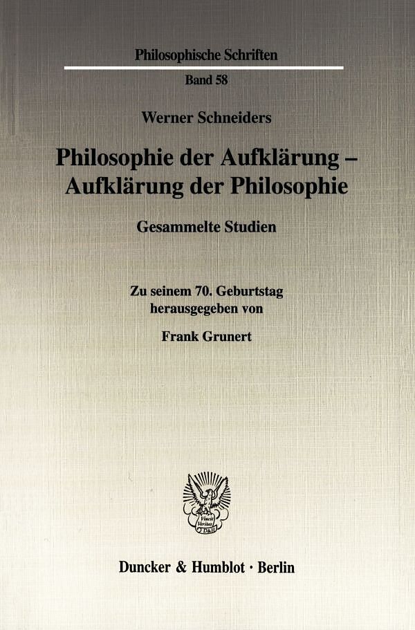 Über Jahrzehnte hinweg hat Prof. Dr. Dr. h.c. Werner Schneiders (Münster) mit seinem philosophischen und philosophiegeschichtlichen Werk die deutsche wie die internationale Aufklärungsforschung stimuliert. Seine monographischen Studien - genannt seien nur Natu...