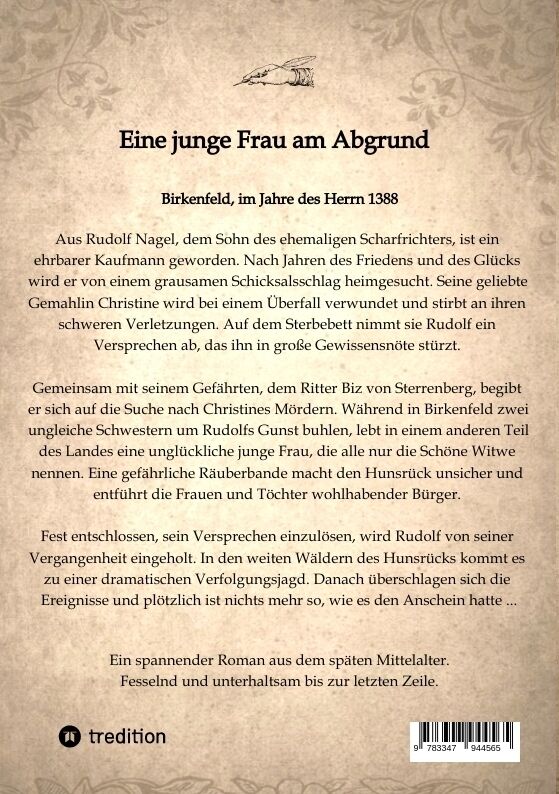 Eine junge Frau am Abgrund Birkenfeld, im Jahre des Herrn 1388. Aus Rudolf Nagel, dem Sohn des ehemaligen Scharfrichters, ist ein ehrbarer Kaufmann geworden. Nach Jahren des Friedens und des Glücks wird er von einem grausamen Schicksalsschlag heimgesucht. Sein...