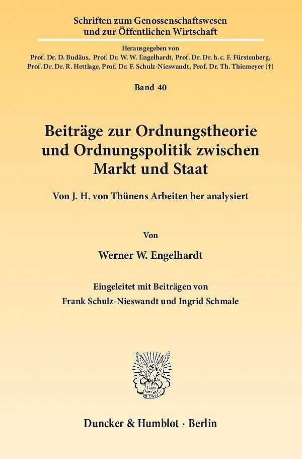 Frank Schulz-Nieswandt Bemerkungen zur gemeinwirtschaftlichen, einschließlich genossenschaftlichen Einzelwirtschaftslehre und Sozialpolitikwissenschaft im System der Wissenschaft von der Gesellschaftsgestaltungspolitik Werner Wilhelm Engelhardt zum 85. Geburtstag Ingrid Schmale Der Thünen-Experte Werner Wilhelm Engelhardt feierte am 13. Februar 2011 seinen 85. Geburtstag Beiträge von Werner W. Engelhardt Ökonomische Denktraditionen, Ökonomismus versus Ethik und die kulturellen Aufgaben der Zukunft Sozialphilosophische, sozialwissenschaftliche und praxisbezogene sozialpolitische Ansätze bei Johann Heinrich von Thünen Grundsätzliche und aktuelle Aspekte der Sicherung, Subsidiarität und Sozialpolitik Die neue Aktualität von Johann Heinrich von Thünen Konzeptionen und Institutionen jenseits von Angebot und Nachfrage. Zum kulturellen Hintergrund der Marktwirtschaft und dessen Bedeutung im Lichte des Ökonomismusproblems J. H. von Thünen als Vorläufer der Sozialen Marktwirtschaft Wider das »Gesetz des Dschungels«: Johann Heinrich von Thünens Eintreten für moralisch fundierten Kapitalismus unter dem Einfluss von Adam Smith und Immanuel Kant J. H. von Thünens Eintreten für die Gründung eines »Mecklenburgischen Ritterschaftlichen Credit-Vereins« eine gemeinwirtschaftliche Unternehmensinitiative Gemeinwirtschaftliche Genossenschaften ein möglicher Widmungstyp von Genossenschaften unter sechsen J. H. von Thünen über die »Freiheit« des Marktes und den »Zwang« des Staates. Zur 225. Wiederkehr seines Geburtstages G. F. Sartorius von Waltershausen, J. H. von Thünen und die Anfänge der deutschen Sozialpolitik des 19. Jahrhunderts Zu Methodenfragen ordnungstheoretischer und ordnungspolitischer Konzeptionen im Verständnis J. H. von Thünens, W. Euckens und G. Weissers besonders bezogen auf »Dritte Ordnungen« zwischen Markt und Staat Sozialpolitische und genossenschaftliche Beiträge zur Bewältigung der »Sozialen Frage« Westeuropas im 19. und 20. Jahrhundert Nachweis der Erstveröffentlichungen Namensregister Sachregister