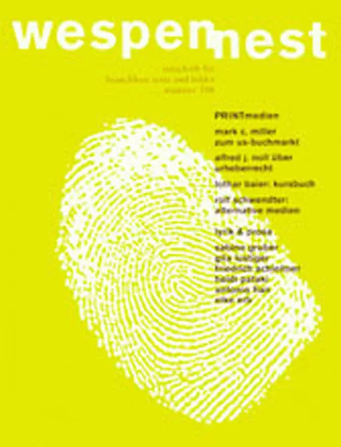 Mark Crispin Miller über den US-Buchmarkt. Alfred J. Noll über Urheberrecht. Lothar Baier: Kursbuch-Dialog. Rolf Schwendter: Alternative Printmedien. Plus Beiträge von Herbert J. Wimmer und Klaus Bittermann. Prosa & Lyrik von Sabine Gruber, Alfred Kollerit...