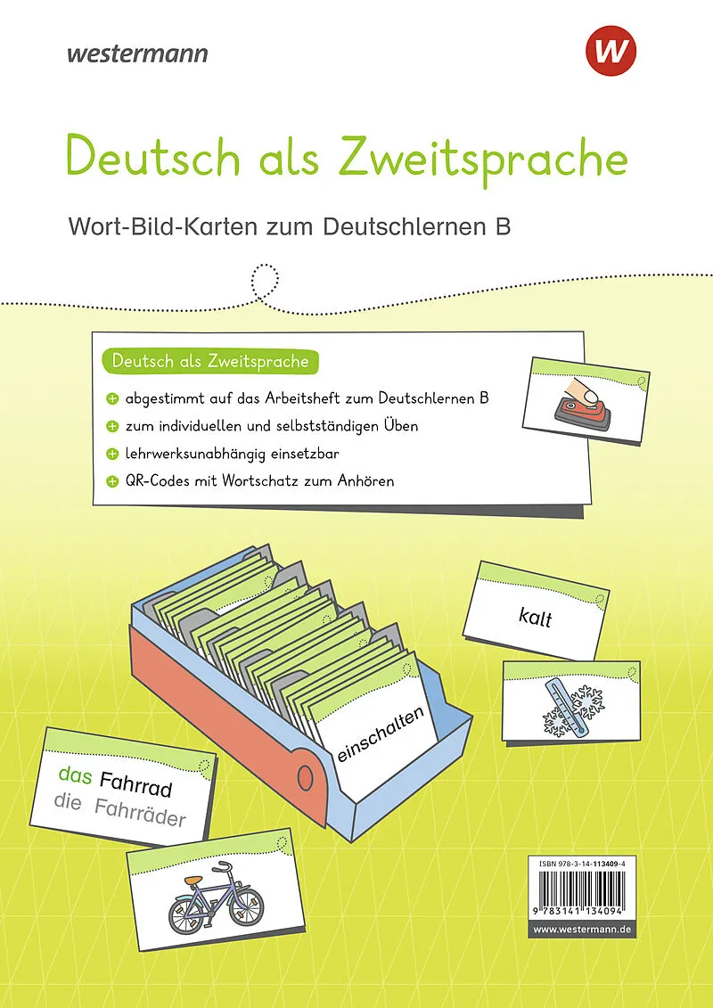 Die "Wort-Bild-Karten zum Deutschlernen B bestehen aus 320 Kärtchen, die Schülerinnen und Schülern mit geringen Deutschkenntnissen das Deutschlernen erleichtern sollen. 281 Karten sind mit Begriffen und passenden Illustrationen versehen, 9 Karten sind mit QR-...