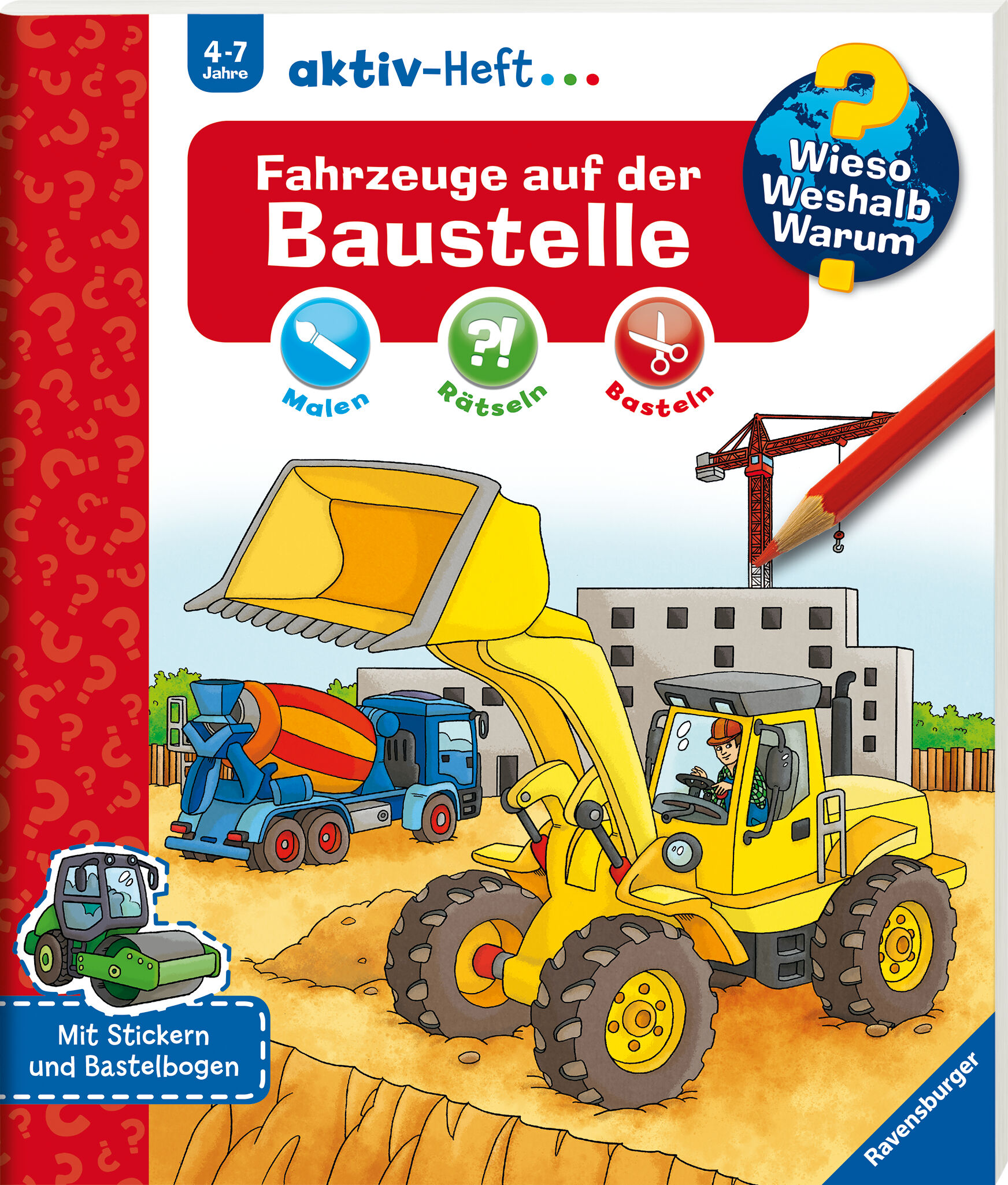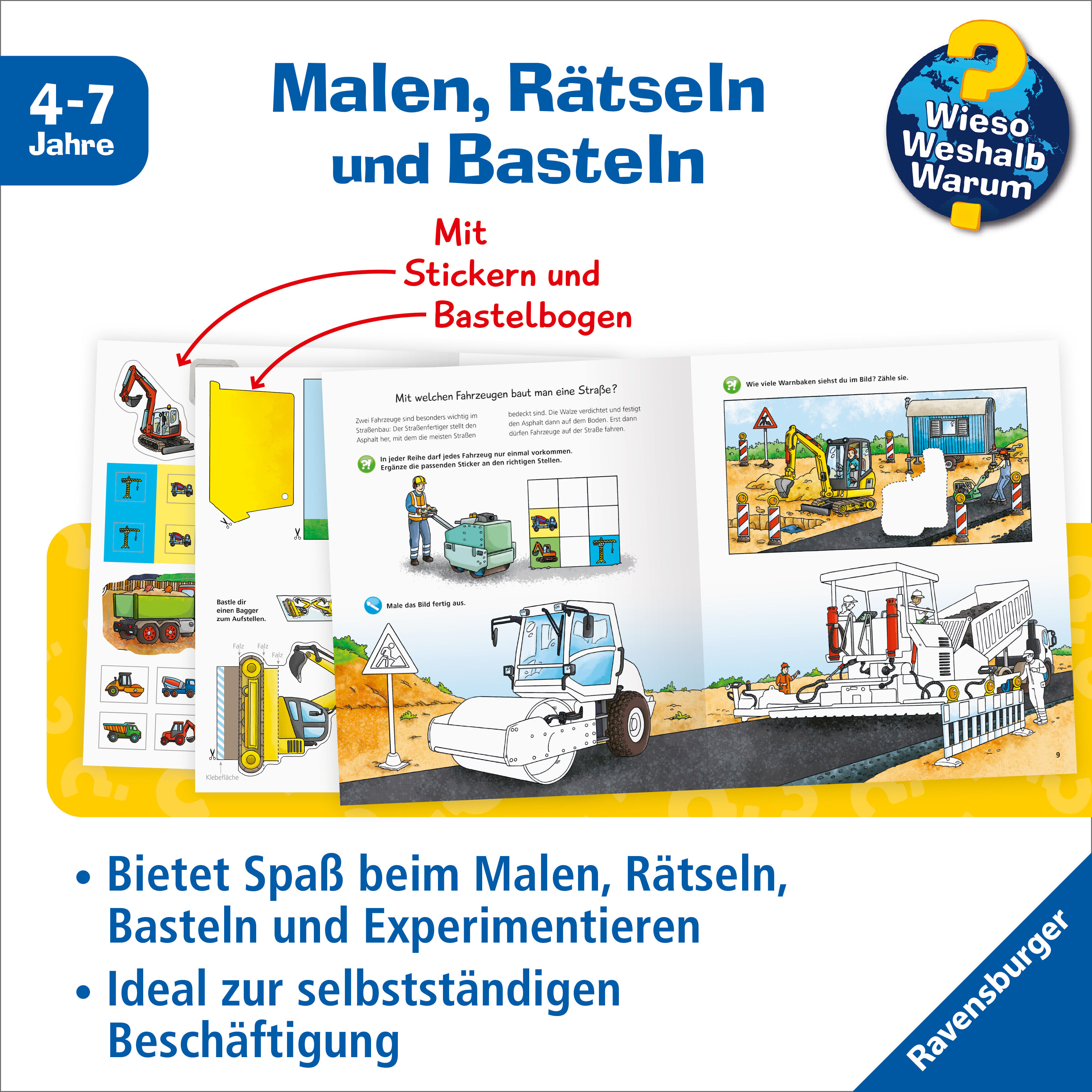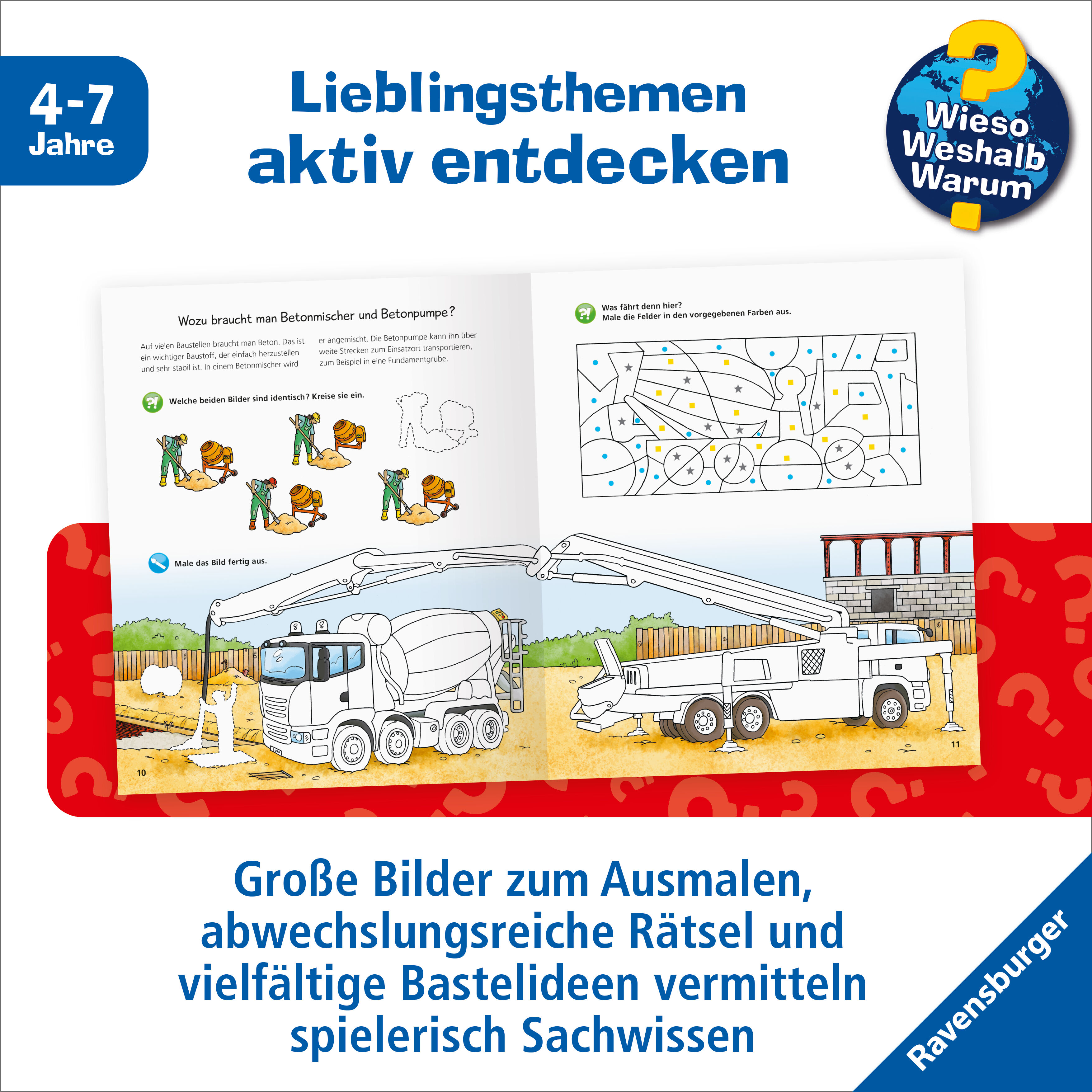 Was können Bagger? Wo hilft ein Kran? Welche Fahrzeuge bauen Häuser? Große Ausmalbilder, knifflige Rätsel und attraktive Bastel- und Spielideen laden Kinder zum aktiven Entdecken ein. Mit kurzen Wissenstexten, über 30 Stickern und einem Bastelbogen. Wieso? Wes...