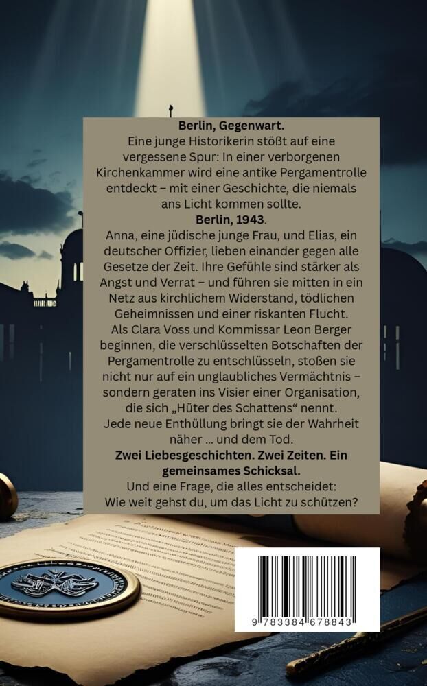 In deinem Roman Spur des Lichts geht es zusammengefasst um eine spannende Mischung aus historischem Geheimnis, Gegenwarts-Thriller und Liebesgeschichte: Ausgangslage: In Berlin wird bei Archivarbeiten eine antike Pergamentrolle entdeckt. Sie enthält verschlüss...In deinem Roman Spur des Lichts geht es zusammengefasst um eine spannende Mischung aus historischem Geheimnis, Gegenwarts-Thriller und Liebesgeschichte: Ausgangslage: In Berlin wird bei Archivarbeiten eine antike Pergamentrolle entdeckt. Sie enthält verschlüsselte Aufzeichnungen aus der Zeit des Zweiten Weltkriegs das Zeugnis einer verbotenen Liebe zwischen Anna, einer jungen jüdischen Frau, und Elias, einem deutschen Wehrmachtsoffizier, der insgeheim für den Widerstand arbeitet. Diese Liebesgeschichte ist eingebettet in ein geheimes kirchliches Fluchtnetz, das unter Lebensgefahr Menschen vor der Deportation rettete. Doch die Rolle enthält auch brisante Namen, Hinweise auf Helfer und Mittäter und ist daher für manche mächtige Kreise in der Gegenwart gefährlich. Die Jetztzeit: Die junge Historikerin Clara Voss und der Kriminalkommissar Leon Berger beginnen, die Zeichen und Codes zu entziffern. Je mehr sie erfahren, desto klarer wird: Sie treten in die Fußstapfen eines längst vergangenen Kampfes und geraten ins Visier der Hüter des Schattens, einer geheimen Organisation, die die Wahrheit um jeden Preis im Dunkeln halten will. Auf ihrer Reise durch Berlin, unterirdische Katakomben, verborgene Kirchenkammern und internationale Spuren decken sie Stück für Stück Annas und Elias' Schicksal auf und müssen gleichzeitig um ihr eigenes Überleben kämpfen. Themen & Kernelemente: Eine doppelte Liebesgeschichte: Anna & Elias in den 1940ern / Clara & Leon heute Berliner Schauplätze, historische Fakten und packende Thriller-Elemente Moralische Frage: Ist man bereit, sein Leben zu riskieren, um die Wahrheit ans Licht zu bringen? Die symbolische Botschaft: Licht bricht durch Schatten wenn jemand den Mut hat, es zu tragen. 📚 Kurz gesagt: Spur des Lichts ist ein historischer Verschwörungs-Thriller über Liebe, Mut und Wahrheit verwebt Vergangenheit und Gegenwart, Enthüllung und Gefahr, und zeigt, dass manche Geschichten so wichtig sind, dass sie nicht erneut im Dunkeln verschwinden dürfen.
