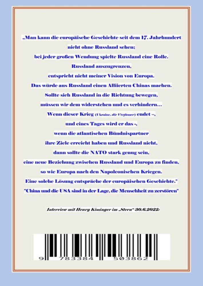 DIE GESCHICHTE RUSSLAND DEUTSCHLAND: Aller Anfang ist schwer sagt schon das bekannte Sprichwort, und so war es auch schon für den deutschen Freiherrn von Leibniz schwer, den russischen Zaren Peter I. zu überzeugen, dass das russische Volk unbedingt einen europ...DIE GESCHICHTE RUSSLAND DEUTSCHLAND: Aller Anfang ist schwer sagt schon das bekannte Sprichwort, und so war es auch schon für den deutschen Freiherrn von Leibniz schwer, den russischen Zaren Peter I. zu überzeugen, dass das russische Volk unbedingt einen europäischen Bildungsgrad in Bezug auf Kultur, Wissenschaft und Forschung vermittelt bekommen müsse. Leibniz erlaubte sich also 1716, den gerade nicht allzu weit von Hannover entfernt, in Bad Pyrmont kurenden russischen Zaren Peter I. aufzusuchen. Es folgte eine sehr langjährige deutsch-russische Geschichte als am 23. Januar 1755 die Kaiserliche Moskauer Universität durch Zarin Elisabeth gegründet wurde. Seit 1940 trägt sie den Namen Lomonossow-Universität, nach dem russischen Gelehrten Michail Wassiljewitsch Lomonossow. In dieser Einleitung gilt es vor allem, eine Hängebrücke von den Zarenzeiten zu unserer heutigen vollkommen anderen, aber nicht besseren Zeit darzustellen. Auch, wenn es wehtun könnte: von Piotr Alexejewitsch Romanow, Zar Peter I. von Russland, später der Große genannt, zu Wladimir Wladimirowitsch Putin, Präsident der Russischen Föderation: Die vielen Kriege aller Länder gegenseitig können es nicht sein, denn die gibt es seit Menschengedenken. Nein, was uns zuerst einmal verbindet, ist die Tatsache, dass wir alle Europäer sind. Moskau genauso wie Berlin. Aber eben auch die deutsch-russischen Familienbande, denn fast alle Zaren und Zarinnen kamen aus Deutschland nach Russland und haben dort viel Gutes und natürlich auch, was allzu menschlich ist, weniger Gutes hinterlassen. Wollen wir aber mal versuchen, das wenigstens Verbindende in diesem Buch zu beschreiben, denn Hass aus Unkenntnis heraus kann auf keinen Fall zu gegenseitigem Verständnis und damit Frieden führen! RUSSLAND IN EUROPA - Einleitung Das europäische Russland ist der westliche und bevölkerungsreichere Teil Russlands. Er liegt geografisch in Europa, im Gegensatz zum dünn besiedelten und weitaus größeren östlichen Teil des Landes, der in Asien liegt und die gesamte nördliche Region des Kontinents umfasst. Das Uralgebirge teilt Russland in zwei Hälften und bildet die Grenze zwischen Europa und Asien auf dem eurasischen Superkontinent. Die Grenze zwischen dem europäischen und asiatischen Russland im Süden ist nicht genau festgelegt. Das europäische Russland umfasst den größten Teil Osteuropas und erstreckt sich über etwa 40 % der gesamten europäischen Landmasse, mit über 15 % der Gesamtbevölkerung, was Russland zum größten und bevölkerungsreichsten Land Europas macht. Interview mit Henry Kissinger im Stern 30.6.2022: Man kann die europäische Geschichte seit dem 17. Jahrhundert nicht ohne Russland sehen, bei jeder großen Wendung sielte Russland eine Rolle. Russland auszugrenzen entspricht nicht meiner Vision von Europa. Das würde aus Russland einen Alliierten Chinas machen. Sollte sich Russland in die Richtung bewegen, müssen wir dem widerstehen und es verhindern Wenn dieser Krieg (Ukraine, die Verfasser) endet und eines Tages wird er das -, wenn die atlantischen Bündnispartner ihre Ziele erreicht haben und Russland nicht, dann sollte die Nato stark genug sein, eine neue Beziehung zwischen Russland und Europa zu finden, so wie Europa nach den Napoleonischen Kriegen. Eine solche Lösung entspräche der europäischen Geschichte." "China und die USA sind in der Lage, die Menschheit zu zerstören"