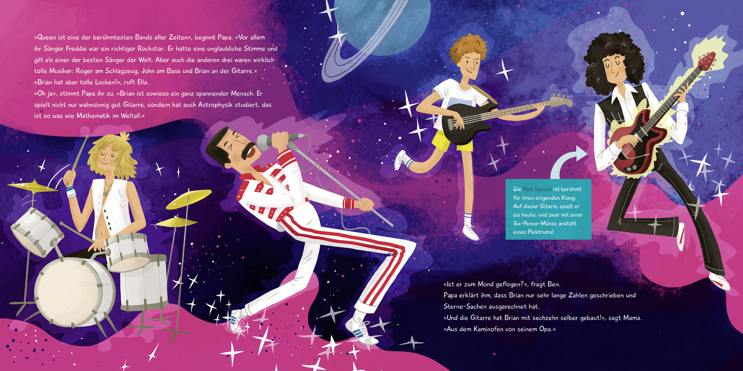 Eine Musikbiografie für alle, die Queen und ihre Hits mit ihren Kindern noch einmal neu entdecken wollen: Ella und Ben sollen ihr Zimmer aufräumen. Zum Glück fällt Ella ein Trick ein, der bei Papa immer klappt: »Erzähl doch mal von Queen!« Und Papa erzählt .....
