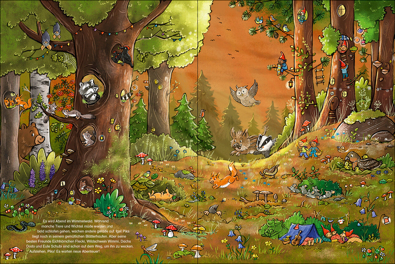 Gute Nacht im Wimmelwald! Die Sonne geht unter, es wird Abend im Wimmelwald. Für einige Tiere beginnt die Schlafenszeit, während andere gerade aufstehen. Auch Eichhörnchen Flecki, Wildschwein Wimmi, Dachs Dodo, Igel Piks und Eule Schubi sind noch wach. Sie la...