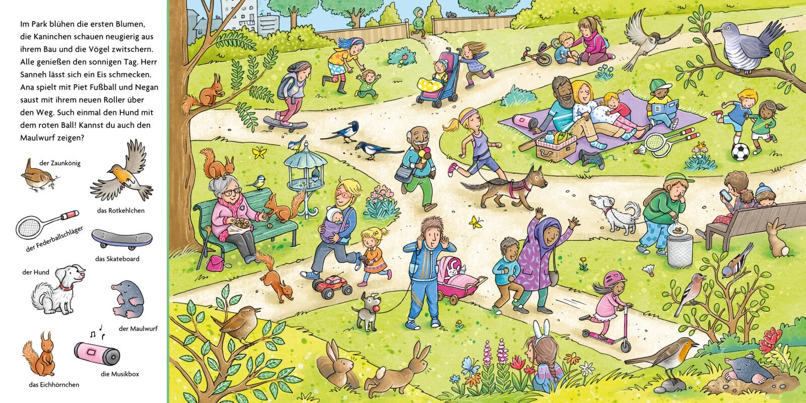 Erstes Buch zum Sachen suchen und Wörter lernen! Hinaus in den Park und den Wald, denn hier gibt es so viel zu entdecken! In der Wiese tummeln sich Ameisen, Marienkäfer und viele andere kleine Krabbeltiere. Hier hoppelt ein Kaninchen, dort klettert ein Eichhö...