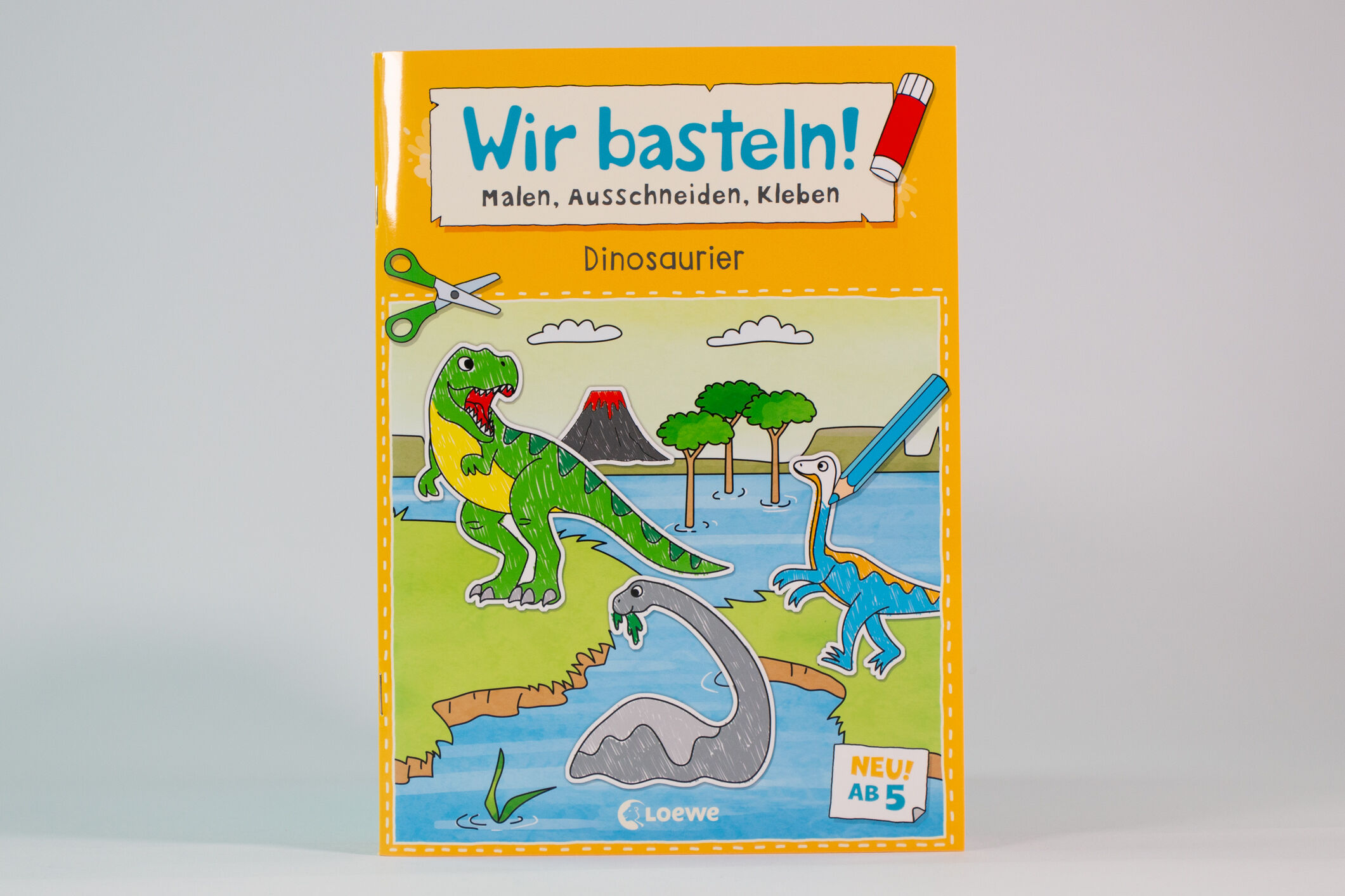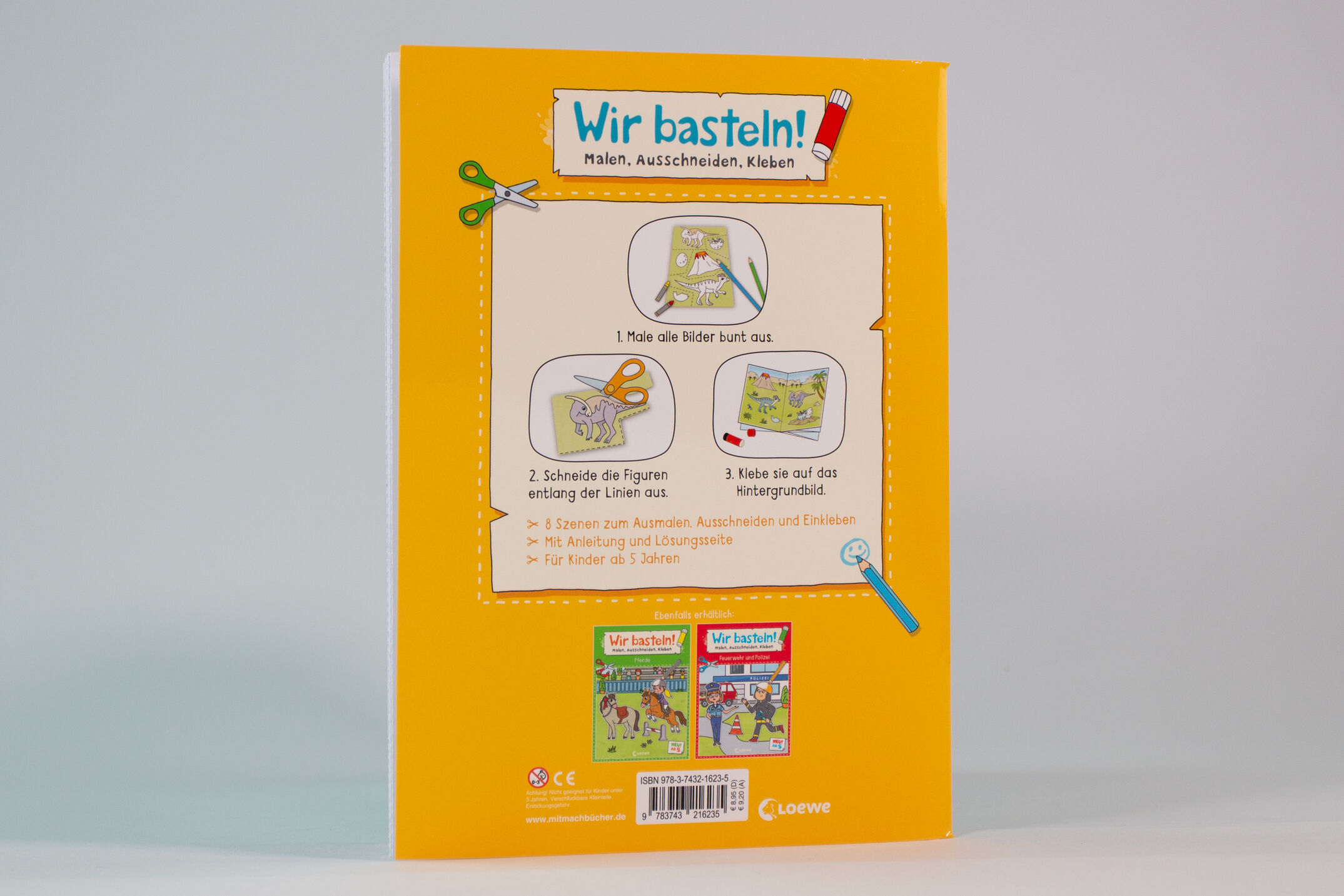Wir basteln! ab 5 Jahren - Malen, Ausschneiden, Kleben - Dinosaurier Bastelspaß mit Dinosauriern 1. Male alle Bilder bunt aus. 2. Schneide die Figuren entlang der Linien aus. 3. Klebe sie auf das Hintergrundbild. Gestalte bunte Welten! 8 Szenen zum Ausmalen, A...
