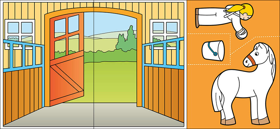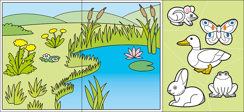 So macht Basteln Spaß! 1. Male alle Bilder bunt aus. 2. Schneide die Figuren entlang der dicken Linien aus. 3. Klebe sie auf das Hintergrundbild. Erstes Basteln mit extradicken Umrisslinien 19 Motive zu unterschiedlichen Themen Mit Anleitung und Lösungsseite X...