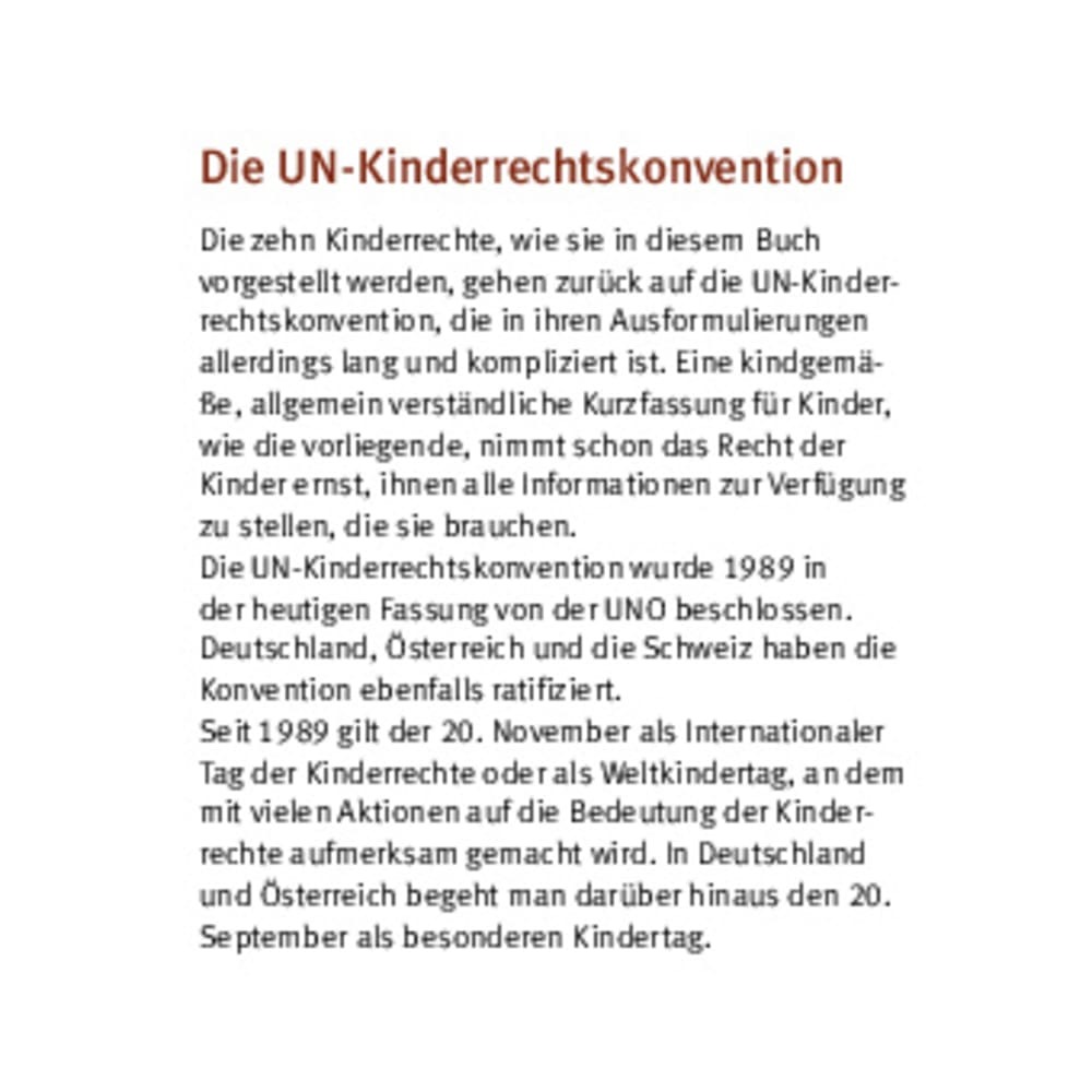 Die Kinderrechte bekannt zu machen, ist vielen Menschen ein Anliegen. Doch wie kann es gelingen, den Kindern selbst zu zeigen, welche Rechte es zu ihrem Schutz gibt? Und was heißt das konkret für das Zusammenleben im Kindergarten, in der Schule oder in der Familie? In einfachen Szenen und kurzen Texten erleben Kinder, was die UN-Kinderrechtskonvention für sie ganz persönlich bedeutet.