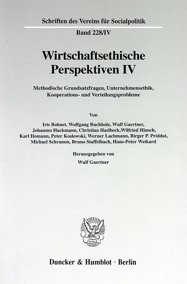 Inhalt: K. Homann, Normativität angesichts systemischer Sozial- und Denkstrukturen - J. Hackmann, Gewinnmaximierung und Unternehmerethik. Zu einem wohlfahrtsökonomisch ausgerichteten wirtschaftsethischen Alternativansatz - B. Staffelbach, Zum Nutzen empirischer Forschung in der Unternehmensethik - W. Gaertner, Rationalität und Normen - B. P. Priddat, Rationalität, Moral und Person - W. Buchholz / C. Haslbeck, Überwindung von Kooperationsproblemen durch Präferenzänderungen? - I. Bohnet, Solidarität durch Salienz - H.-P. Weikard, Können Verpflichtungen gegenüber zukünftigen Generationen vertragstheoretisch begründet werden? - W. Hinsch, Öffentliche Werte und Wohlfahrtsoptionen - M. Schramm, Bürgergeld "light". Sozialpolitik für den Arbeitsmarkt - P. Koslowski, Spekulation und Insider-Handel. Über das wirtschaftsethische Problem des Insider-Wissens - W. Lachmann, Die Diätenregelung für Abgeordnete des Deutschen Bundestages. Versuch einer (wirtschafts)-ethischen Bewertung