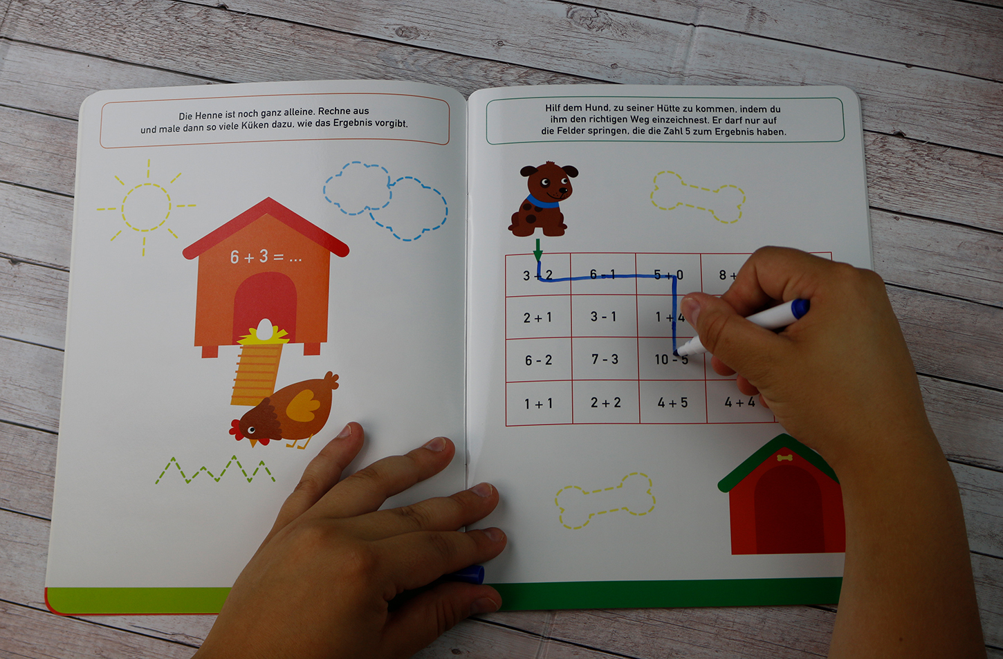 Kannst du schon Plus und Minus? Dann hilf dem Hund, zu seiner Hundehütte zu finden, indem du die Rechenaufgaben löst. Zähle anschließend die verschiedenen Tiere auf dem Bauernhof und schreibe ihre Anzahl in die Kästchen. Und was folgt als Nächstes? - Spieleris...