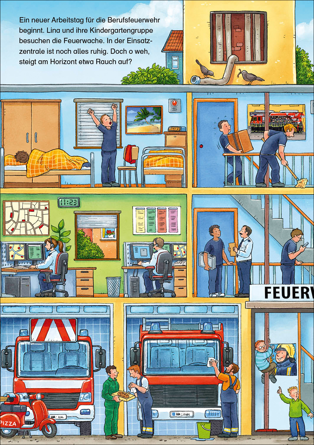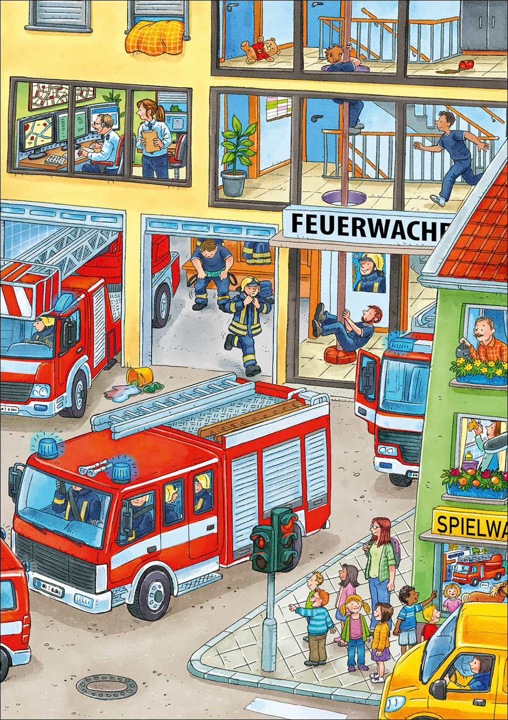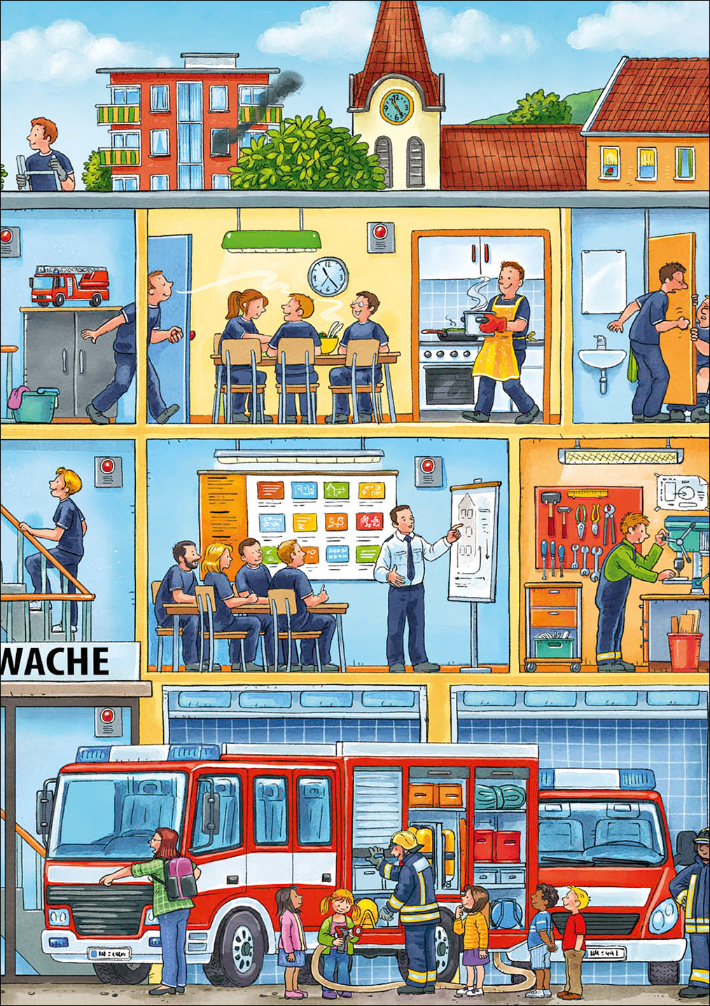 Bei der Feuerwehr geht es rund! In einer Wohnung ist ein Feuer ausgebrochen. Mit lautem Tatütata düsen die Feuerwehrleute zum Einsatzort. Die Drehleiter wird ausgefahren und der Brand mit dem großen Wasserschlauch gelöscht. Was die Feuerwehr wohl sonst noch ma...