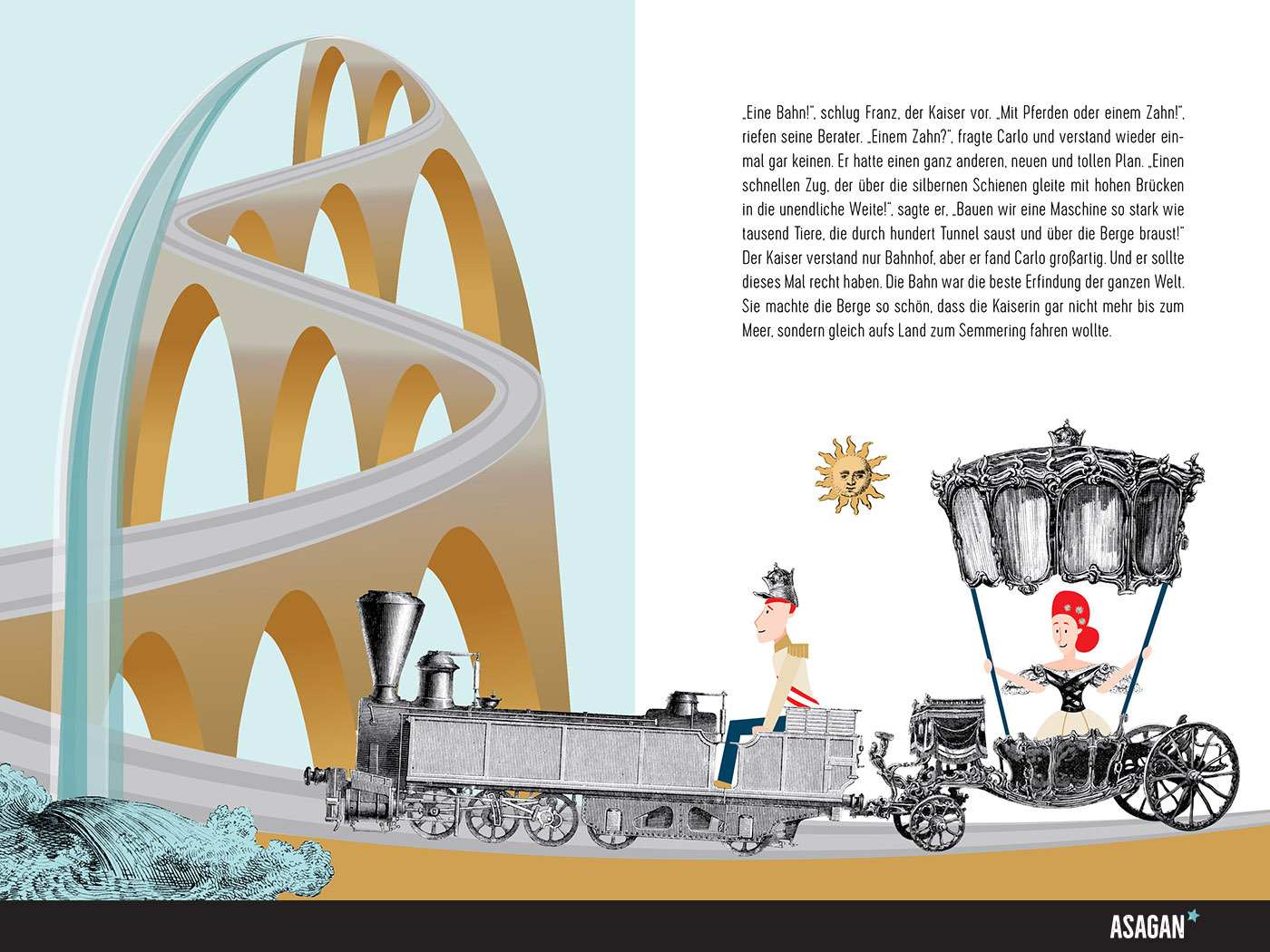 Das 1. Buch von ASAGAN - "Eines der schönsten Bücher Österreichs 2016" 2016 entstand aus bis zu 500 Jahre alten Büchern und Drucken ein zauberhaftes neues Kinderbuch mit Geschichten, die an den aufregendsten Ausflugsorten südlich von Wien spielen. Neue Heldinnen erleben und erobern die uralte Fantasiewelt von ASAGAN. "Die Burgen, Berge und Bahnen im Buch gibt es wirklich", erzählt Autor Wolfgang Hartl, "alle Geschichten basieren auf historischen Begebenheiten und realen Plätzen rund um Semmering, Rax, Schneeberg, Hohe Wand, Wechsel, Bucklige Welt und Wien. Die jungen Leser können die Geschichten demnach nicht nur im Buch entdecken, sondern die Orte auch tatsächlich besuchen und erleben." Die kreativen Köpfe hinter der Fantasiewelt Hinter dem Projekt stehen Wolfgang Hartl und Erika Friedl: Wolfgang Hartl sammelte historische Bücher und bis zu 500 Jahre alte Drucke, schrieb die Geschichten und entwarf mit Erika Friedl die Bühne und Figuren dafür. Herausgekommen ist dabei ein 112 Seiten starkes Hardcover-Buch mit neun spannenden Geschichten und unzähligen, liebevoll und detailreich gestalteten Illustrationen. Inhalt . Bahn frei für Carlo! . Das Schwert am Stein . Murmelherz . Almenstern . Die Wasserprinzessin in Kaiserbrunn . Hohe Wand und Buckliges Meer . Die Überflieger . Zwergenband und U-Bergbahn . Sternengold und Mondsilber Jurybegründung: "In dem Kinderbuch erleben Helden in der Fantasiewelt ASAGAN rund um Semmering, Rax, Schneeberg, Hohe Wand, Wechsel, Bucklige Welt und Wien viele Abenteuer. Illustratorisch werden im Buch teilweise jahrhundertealte Drucke und neue, verspielte Grafiken auf liebevolle Weise und gekonnt ineinander montiert. Die Ebene der Illustration gibt dabei nicht einfach den Inhalt der Geschichte wieder, sondern fügt ihr eine neue Dimension hinzu, die Raum für die eigenen Gedanken und die eigene Fantasie bietet. Die Idee, eine reale Gegend und ihre Geschichten, Fiktion und Wirklichkeit dabei wild vermischt, mit lustvoller Visualität darzustellen und sie so neuen Generationen näherzubringen, ist in diesem Werk besonders gut umgesetzt."