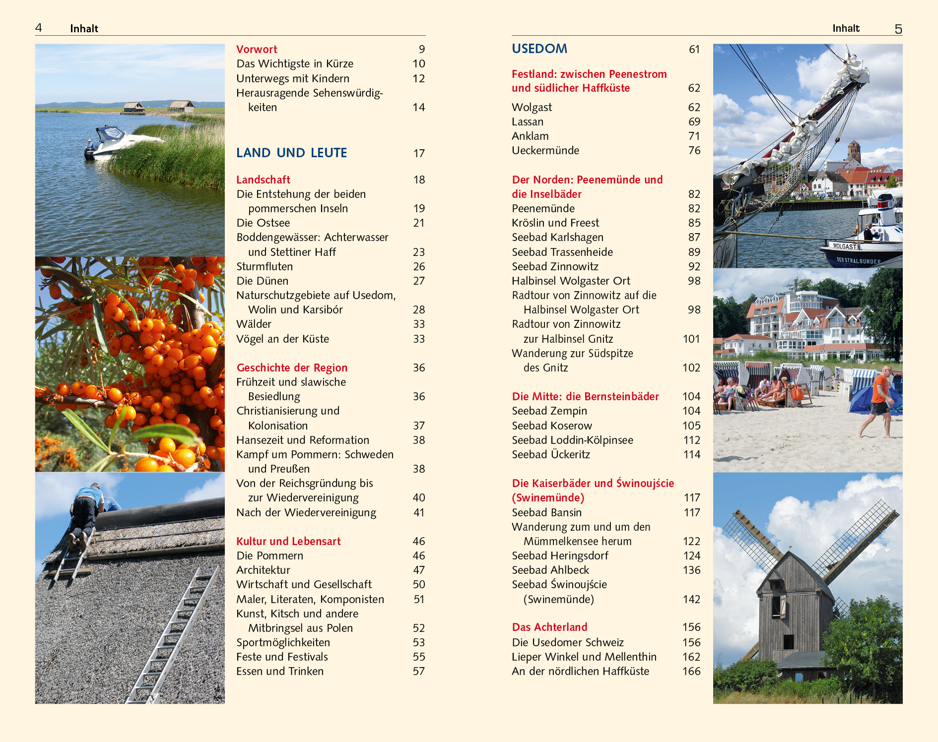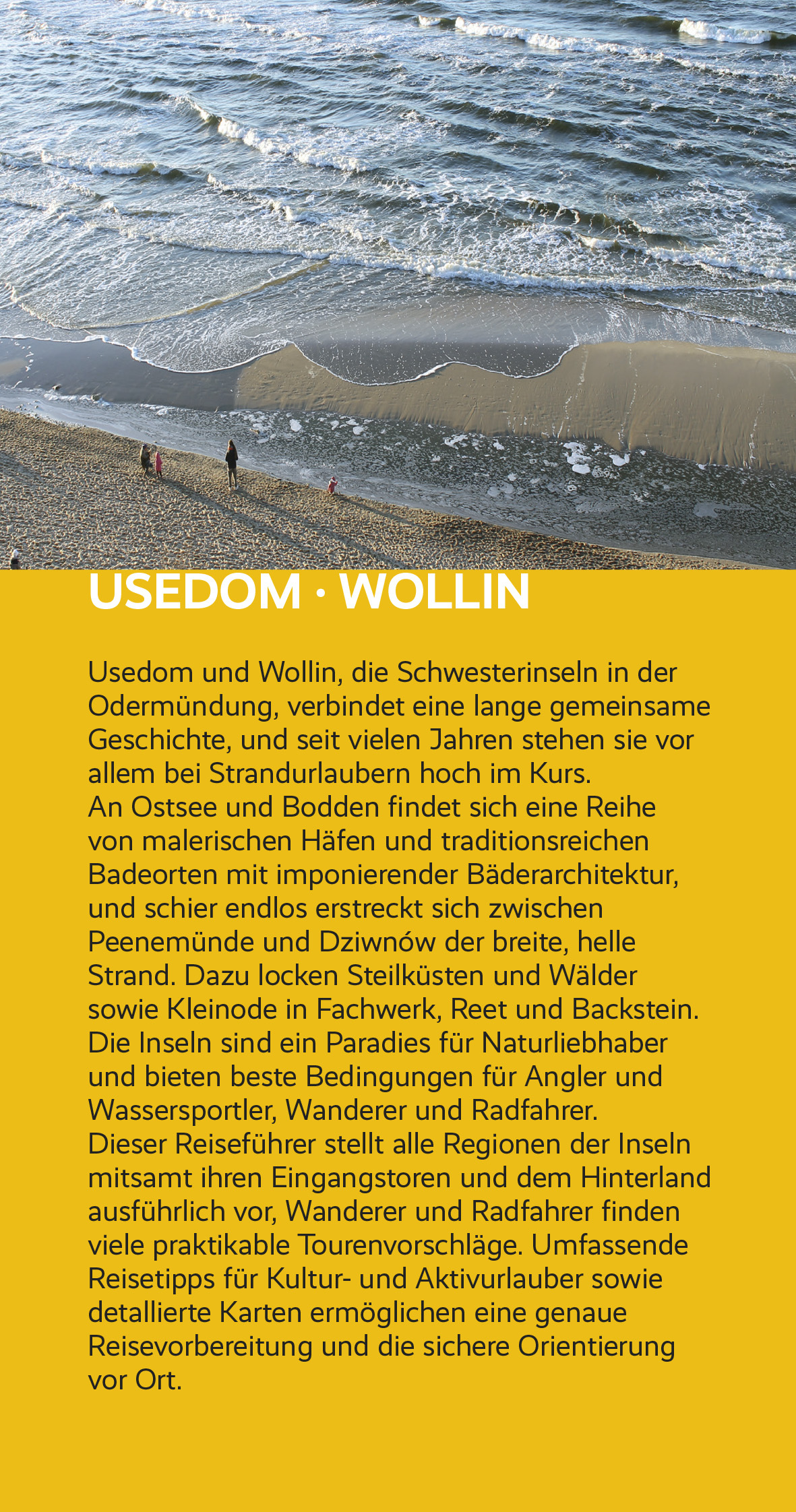 Bereits im frühen 19. Jahrhundert entstanden auf den Inseln Usedom und Wollin die ersten Seebäder. Damals zog es den Hochadel, das neureiche Großbürgertum und überhaupt die gesamte feine Gesellschaft an das Baltische Meer. Das Baden im Meer und der Aufenthalt am Strand waren da noch recht nebensächlich. Um die vorletzte Jahrhundertwende wurden die beiden pommerschen Inseln zur begehrten Sommerfrische auch für den gehobenen Mittelstand und zahlreiche Künstler. Die mondänen Seebäder auf Usedom prosperierten nun ebenso wie das vornehme Misdroy auf Wollin. Besonders die Hauptstädter tummelten sich jetzt gerne in der "Badewanne der Berliner", wie Usedom damals scherzhaft genannt wurde. Die verspielte, elegante Bäderarchitektur der neuen Hotels, Pensionen und Strandvillen verwandelte die Orte in traumhafte, einzigartige Idealstädte. Hundert Jahre später - nach zwei Weltkriegen, der Teilung Deutschlands und nach der politischen Wende in Polen und Ostdeutschland - sind die Bäder ebenso wie die touristische Infrastruktur tüchtig auf Vordermann gebracht und grundlegend modernisiert: Wellness, Spa und Thalasso und die durch Brandungsaerosole angereicherte, gesunde Seeluft sorgen für einen erholsamen Urlaub, zahlreiche Veranstaltungen für viel Kultur. Stille Dörfer mit rohrgedeckten Häusern, Ruhe und Beschaulichkeit, Seen mit dichten Schilfgürteln und verzweigten Buchten sowie viel ursprüngliche Natur herrschen dagegen wohltuend im reizvollen, leicht gewellten Hinterland der beiden Inseln.Viele deutsche Urlauber lieben und loben inzwischen den kontrastreichen Charme dieser herrlichen bi-nationalen Region ganz im Nordosten Deutschlands und ganz im Nordwesten Polens. Das bis heute vergleichsweise günstige Preis-Leistungs-Verhältnis auf polnischer Seite ist gewiss zusätzlich ein gewichtiger Anreiz für junge Familien mit Kindern. Die Eilande sind zudem geradezu wie geschaffen für einen Aktivurlaub, nicht zuletzt weist die Zweiländerinsel Usedom fast 200 Kilometer ausgebaute Radwege auf. Die Möglichkeiten für Freizeitvergnügungen sind hier wie da fast grenzenlos: Segeln auf der Ostsee, auf dem Achterwasser oder auf dem Stettiner Haff, Angeln in den fischreichen Seen beider Inseln, Golfen für Anfänger und auf höchstem Niveau, Reiten und Wandern querfeldein und durch Naturschutzgebiete, Kiten und Surfen, Nordic Walking an den Stränden und dahinter, Sightseeing in den Seebädern mit ihrer wunderbar restaurierten Bäderarchitektur.Im Frühling verzaubert eine überaus bunte Blütenpracht, ein Feuerwerk an Farben. Im Sommer locken warme, sehr sonnenreiche Badetage, im Herbst besonders lang anhaltende, intensive Farbenkompositionen der weithin rot leuchtenden pommerschen Buchenwälder. In kalten Wintern betört die vom Packeis umklammerte Küste, wenn die Kälte an den Stränden bizarre Kunstwerke aus Eis und Schnee formt. Wegen all dieser Vorzüge ist Usedom längst ein Ganzjahresreiseziel geworden, das polnische Wolin dagegen kann bis auf das illustre Seebad Miedzyzdroje (Misdroy) noch weitgehend als Geheimtipp gelten.>>> Weitere Reiseführer zu interessanten Regionen in Deutschland finden Sie auf der Website des Trescher Verlags.