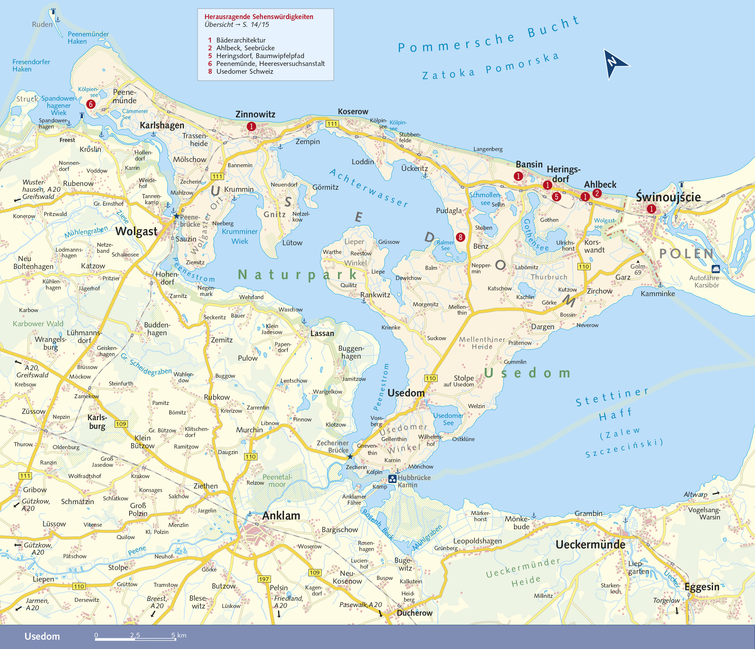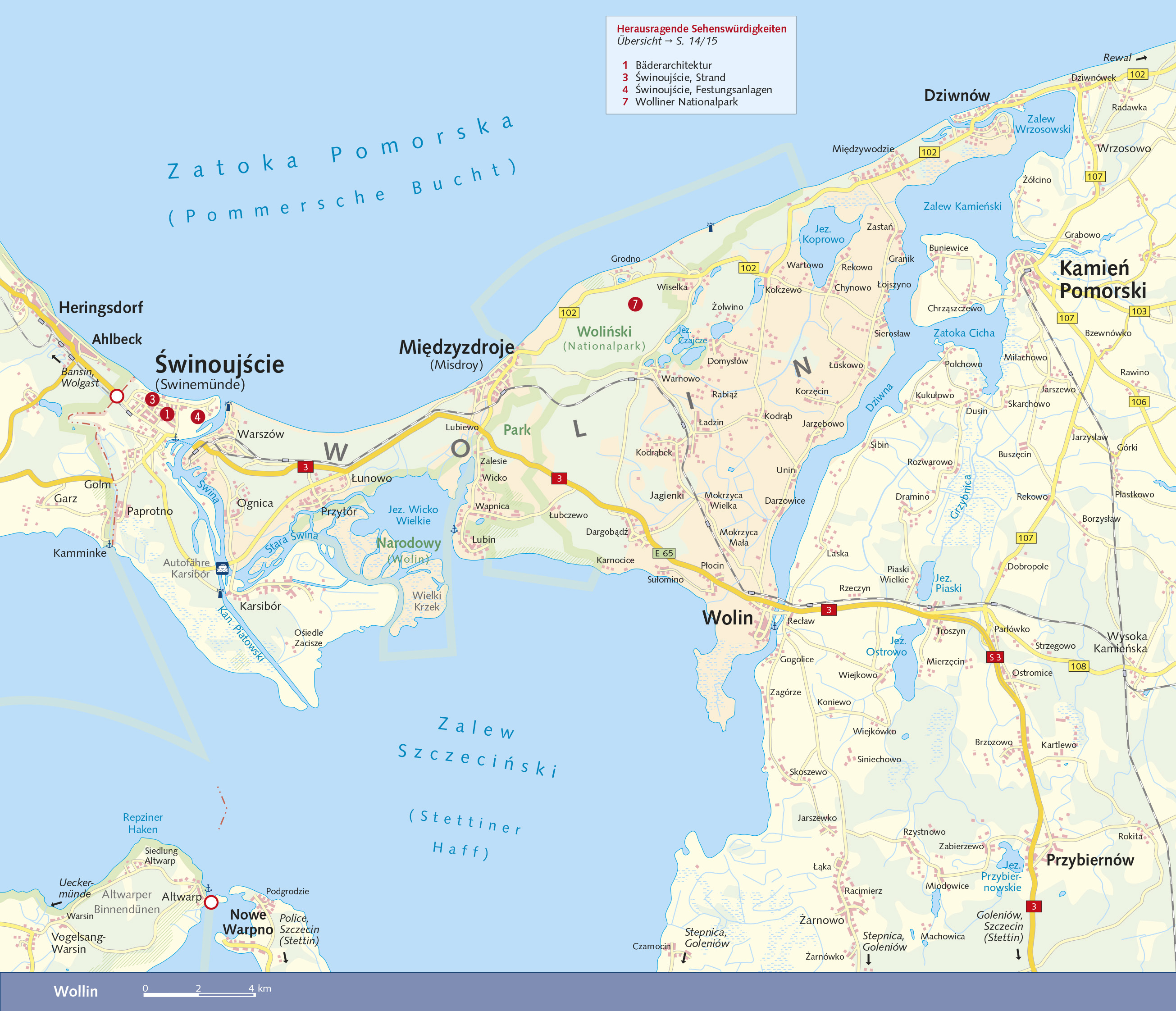 Seite 24 HEIMAT DER WISENTE Der Wolliner Nationalpark > Seite 28 BAROCKES TOR ZUR INSEL USEDOM Wolgast > Seite 62 MALER DER FRÜHROMANTIK Philipp Otto Runge > Seite 68 WIEGE DER RAUMFAHRT UND NAZITERROR Peenemünde > Seite 80 GESCHICHTEN VON DER BERNSTEINHEXE Koserow am Streckelsberg > Seite 108 HAUPTSTADT DER BÄDERARCHITEKTUR Heringsdorf > Seite 124 BREITESTER STRAND USEDOMS UND POLENS winoujcie > Seite 142 SAGENUMWOBENES "BALTISCHES ATLANTIS" Vineta > Seite 205 LAND DER 44 INSELN Das Swinedelta > Seite 215 Usedom und Wollin, die Schwesterinseln in der Odermündung, verbindet eine lange gemeinsame Geschichte, und seit vielen Jahren stehen sie vor allem bei Strandurlaubern hoch im KurSeite An Ostsee und Bodden findet sich eine Reihe von malerischen Häfen und traditionsreichen Badeorten mit imponierender Bäderarchitektur, und schier endlos erstreckt sich zwischen Peenemünde und Dziwnów der breite, helle Strand. Dazu locken Steilküsten und Wälder sowie Kleinode in Fachwerk, Reet und Backstein. Die Inseln sind ein Paradies für Naturliebhaber und bieten beste Bedingungen für Angler und Wassersportler, Wanderer und Radfahrer. Dieser Reiseführer stellt alle Regionen der Inseln mitsamt ihren Eingangstoren und dem Hinterland ausführlich vor, Wanderer und Radfahrer finden viele praktikable Tourenvorschläge. Umfassende Reisetipps für Kultur- und Aktivurlauber sowie detallierte Karten ermöglichen eine genaue Reisevorbereitung und die sichere Orientierung vor Ort. >>> Weitere Reiseführer zu interessanten Regionen in Deutschland finden Sie auf der Website des Trescher Verlags.