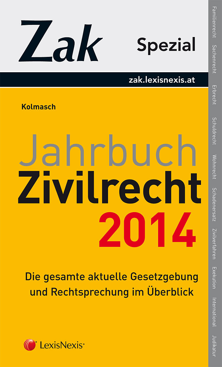 Behalten Sie den Überblick: alle Neuerungen im Zivilrecht in einem handlichen Zak-Spezial-Taschenbuch zum Nachlesen und Nachschlagen. Diese bereits im elften Jahrgang erscheinende Übersicht bietet Rechtsanwälten, Richtern, Berufsanwärtern und allen anderen mi...Behalten Sie den Überblick: alle Neuerungen im Zivilrecht in einem handlichen Zak-Spezial-Taschenbuch zum Nachlesen und Nachschlagen. Diese bereits im elften Jahrgang erscheinende Übersicht bietet Rechtsanwälten, Richtern, Berufsanwärtern und allen anderen mit zivilrechtlichen Fragen befassten Rechtsanwendern eine verlässliche Grundinformation und einen unentbehrlichen Wegweiser durch die Vielfalt an Informationsquellen. Inhalt - Gesetzgebung: Übersicht aller neuen Gesetze und Gesetzesänderungen sowie Zusammenfassungen der wichtigsten Neuerungen, ua zum Kindschafts- und Namensrechts-Änderungsgesetz 2013, zum Adoptionsrechts-Änderungsgesetz 2013, zur Grundbuchsgebührennovelle, zum Zahlungsverzugsgesetz, zur Verordnungs- und Gesetzesbeschwerde in Zivil- und Strafverfahren sowie zum Schiedsrechts-Änderungsgesetz 2013. - Übersichtliche Tabellen und Grafiken, zB zur Belastungsgrenze im Unterhaltsrecht, zur Umnummerierung des Kindschaftsrechts im ABGB durch das Kindschafts- und Namensrechts-Änderungsgesetz 2013, zur Fristenberechnung sowie zum Existenzminimum. - Zak-Reisepreisminderungstabelle. - Judikatur: über 1.000 kurze und verständliche Leitsätze der wichtigen Entscheidungen des vergangenen Jahres, sortiert nach Rechtsquellen, samt Anmerkungen, Querverweisen und Fundstellen in juristischen Fachzeitschriften. - Ausführliche Übersichten zur neuen zivilrechtlichen Literatur. - Die aktuellen variablen Werte, zB Regelbedarfssätze, Verzugszinsen sowie Kategorie- und Richtwertmietzinse.