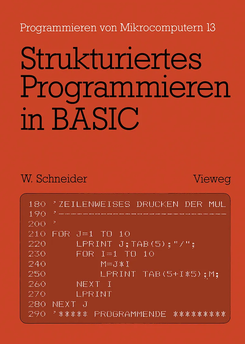 1 Aufbau von Datenverarbeitungsanlagen.- 1.1 Allgemeines.- 1.2 Eingabeeinheiten.- 1.3 Speicher.- 1.4 Rechenwerk.- 1.5 Steuerwerk.- 1.6 Ausgabeeinheit.- 1.7 Struktur einer Datenverarbeitungsanlage.- 2 Programmiersprachen.- 2.1 Maschinensprachen.- 2.2 Assemblersprachen.- 2.3 Problemorientierte Programmiersprachen.- 2.3.1 Compiler.- 2.3.2 Interpreter.- 2.3.3 Vor- und Nachteile von Interpretern bzw. Compilern.- 2.4 Anforderungen an eine problemorientierte Programmiersprache.- 2.4.1 Erlernbarkeit der Programmiersprache.- 2.4.2 Entwicklung strukturierter Programme.- 2.4.3 Wartung entwickelter Programme.- 2.4.4 Übertragung entwickelter Programme auf andere Anlagen.- 2.4.5 Universelle höhere Programmiersprache.- 3 Betriebssysteme.- 3.1 Einbenutzersysteme.- 3.2 Mehrfachbenutzersysteme.- 3.3 Echtzeitsysteme.- 3.4 Firmware.- 3.5 Betriebssysteme von Mikrocomputern.- 3.6 Dialog zwischen Mikrocomputern und Mikrocomputerbenutzer.- 4 Ausstattung von Mikrocomputern.- 4.1 Eingabetastatur.- 4.2 Magnetbandkassettenrecorder.- 4.3 Bildschirm.- 4.4 Drucker.- 4.5 Floppy Disk (Diskette).- 5 Entwicklung von strukturierten Anwenderprogrammen.- 5.1 Problemaufbereitung.- 5.1.1 Problemdefinition.- 5.1.2 Problemanalyse.- 5.2 Strukturierte grafische Darstellung der Problemlösung.- 5.2.1 Allgemeines.- 5.2.2 Strukturblöcke.- 5.2.3 Aufbau von Struktogrammen.- 5.2.4 Strukturbaum.- 5.2.5 Beispiele von Struktogrammen.- 5.2.6 Programmablaufpläne.- 5.2.7 Ersatzdarstellung von Strukturblöcken in Programmablaufplänen.- 5.3 Programmdokumentation.- 5.4 Zusammenfassung.- 5.5 Übungsaufgaben.- 6 Darstellungstechniken zur Beschreibung der Syntax von Programmiersprachen.- 6.1 Beschreibende Texte.- 6.2 Die Backus-Naur-Form (BNF).- 6.2.1 Die Symbole der Backus-Naur-Form.- 6.2.2 Beispielhafte Beschreibung einigereinfacher Sprachelemente der Programmiersprache BASIC mit Hilfe der Backus-Naur-Form (BNF).- 6.3 Das Fahrnetz.- 6.3.1 Die Sinnbilder des Fahrnetzes.- 6.3.2 Beispielhafte Beschreibung einiger einfacher Sprachelemente der Programmiersprache BASIC mit Hilfe von Fahrnetzen.- 6.4 Vergleich der Darstellungstechniken.- 6.5 Zusammenfassung.- 6.6 Übungsaufgaben.- 7 Die Programmiersprache BASIC.- 8 Die allgemeine Programmstruktur in BASIC.- 8.1 Die Grobstruktur von BAS IC-Programmen.- 8.2 Die Grobstruktur von Vereinbarungen und Anweisungen.- 8.3 Kommentare im Programm.- 8.4 Zusammenfassung.- 9 BASIC-Zeichenvorrat und BASIC-Sprachelemente.- 9.1 Allgemeines.- 9.2 BASIC-Sprachelemente.- 9.3 BASIC-Zeichenvorrat.- 10 Konstanten.- 10.1 Numerische Konstanten.- 10.1.1 Ganzzahlige Konstanten.- 10.1.2 Festkomma-Konstanten.- 10.1.3 Gleitkomma-Konstanten.- 10.1.4 Konstanten mit doppelter Genauigkeit.- 10.1.5 Weitere Konstantentypen.- 10.2 Textkonstanten.- 10.3 Boolesche Konstanten.- 10.4 Zusammenfassung.- 10.5 Übungsaufgaben.- 11 Variablen.- 11.1 Allgemeines.- 11.2 Numerische Variablen.- 11.2.1 Einfache numerische Variablen.- 11.2.2 Indizierte numerische Variablen.- 11.2.3 Numerische Felder.- 11.2.4 Die DIM-Vereinbarung (Feldvereinbarung).- 11.3 Textvariablen.- 11.3.1 Textvariablennamen.- 11.3.2 Indizierte Textvariablen.- 11.3.3 Textfelder.- 11.3.4 Die DIM-Vereinbarung (Feldvereinbarung) für Textfelder.- 11.4 Boolesche Variablen.- 11.5 Zusammenfassung.- 11.6 Übungsaufgaben.- 12 Operationszeichen.- 12.1 Arithmetische Operationszeichen.- 12.2 Boolesche Operatoren.- 12.3 Vergleichsoperatoren.- 12.3.1 Vergleich von numerischen Werten.- 12.3.2 Vergleich von Texten.- 12.4 Textoperator.- 12.5 Zusammenfassung.- 13 Standardfunktionen.- 13.1 Numerische Standardfunktionen.- 13.2 Ableitung weiterermathematischer Funktionen mit Hilfe numerischer Standardfunktionen.- 13.3 Standardfunktionen zur Textverarbeitung.- 13.3.1 Bestimmung der Länge von Texten mit Hilfe der Standardfunktion LEN.- 13.3.2 Veränderung von Texten mit Hilfe der Standardfunktionen LEFT$, RIGHT $, MID $.- 13.3.3 Die Standardfunktion STR $ und VAL.- 13.3.4 Die Standardfunktionen ASC und CHR $.- 13.4 Zusammenfassung.- 13.5 Übungsaufgaben.- 14 Ausdrücke.- 14.1 Arithmetische Ausdrücke.- 14.1.1 Die Rangordnung arithmetischer Operatoren.- 14.1.2 Klammerausdrücke.- 14.1.3 Ausdrücke mit Standardfunktionen.- 14.2 Boolesche Ausdrücke.- 14.2.1 Boolesche Ausdrücke mit Booleschen Konstanten.- 14.2.2 Boolesche Ausdrücke mit Booleschen Variablen.- 14.2.3 Rangordnung der Booleschen Operatoren.- 14.2.4 Klammerausdrücke.- 14.3 Textausdrücke.- 14.4 Vergleichsausdrücke.- 14.4.1 Vergleich von arithmetischen Ausdrücken.- 14.4.2 Vergleich von Textausdrücken.- 14.4.3 Verknüpfung von Vergleichsausdrücken über Boolesche Operatoren.- 14.5 Zusammenfassung.- 14.6 Übungsaufgaben.- 15 Zuordnungsanweisungen.- 15.1 Arithmetische Zuordnungsanweisungen.- 15.2 Boolesche Zuordnungsanweisungen.- 15.3 Zuordnungsanweisung von Texten.- 15.4 Zusammenfassung.- 15.5 Übungsaufgaben.- 16 Ausgabeanweisungen.- 16.1 Die allgemeine Form der PRINT-Anweisung.- 16.2 Ausgabeformat der Daten.- 16.2.1 Das Standard-Spaltenformat.- 16.2.2 Das variable Spaltenformat.- 16.2.3 Das Tabellenformat.- 16.3 Der Zeilenvorschub.- 16.4 Ausgabe von Überschriften und numerischen Werten mit kommentierenden Texten.- 16.4.1 Überschriften.- 16.4.2 Ausgabe von numerischen Werten zusammen mit kommentierenden Texten.- 16.5 Die PRINT-USING-Anweisung.- 16.5.1 Formatierte Ausgabe von numerischen Werten.- 16.5.2 Formatierte Ausgabe von Zeichenketten.-16.6 Druckerausgabe.- 16.6.1 Druckerausgabe mit Hilfe von LPRINT bzw. LPRINT USING.- 16.6.2 Druckerausgabe mit Hilfe von PRINT #.- 16.7 Zusammenfassung.- 16.8 Übungsaufgaben.- 17 Eingabeanweisungen.- 17.1 Wertzuweisung mit Hilfe der LET-Anweisung.- 17.2 Eingabe mit Hilfe der READ-DATA-Anweisung.- 17.3 Die RESTORE-Anweisung.- 17.4 Eingabe mit Hilfe der INPUT-Anweisung.- 17.5 Eingabe mit Hilfe der GET-Anweisung (INKEY$, INPUT$).- 17.6 Zusammenfassung.- 17.7 Übungsaufgaben.- 18 Lineare Programme (Sequenzen).- 18.1 Umrechnung von Geschwindigkeiten (KM/H in SM/H).- 18.2 Bremswe…