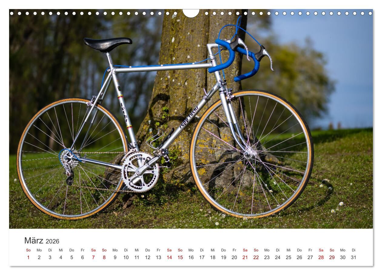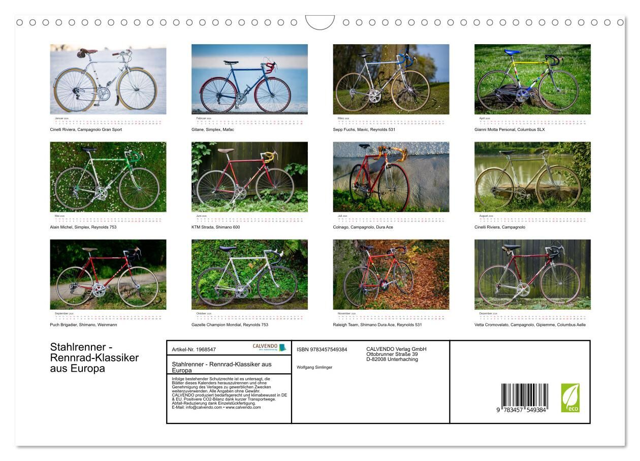 Klassische Rennräder mit Stahlrahmen sind wieder im Trend. Der Kalender zeigt eine Auswahl an klassischen europäischen Rennrädern mit Stahlrahmen aus den 50er, 60er, 70er und 80er Jahren. Fahrräder von Puch, Cinelli, Vetta, Gazelle, Colnago, Raleigh oder Einze...