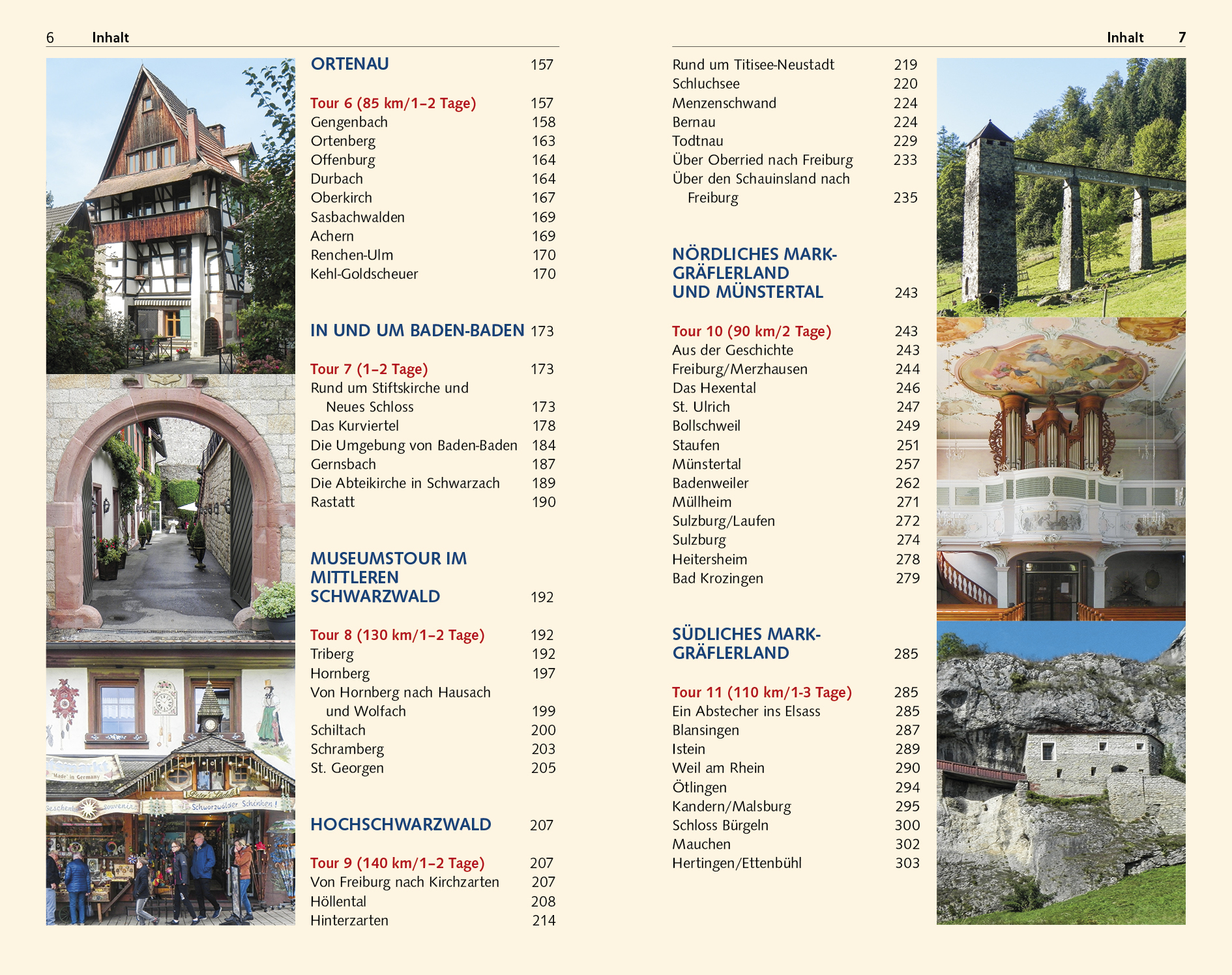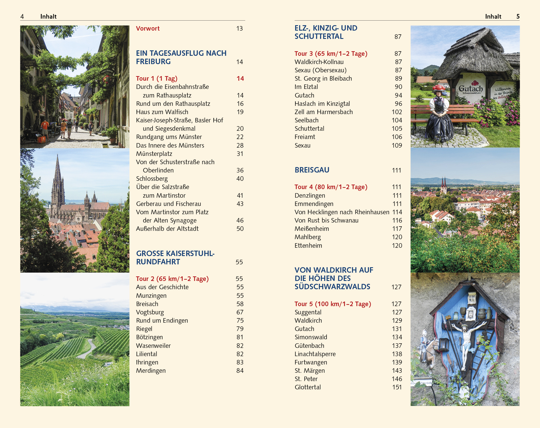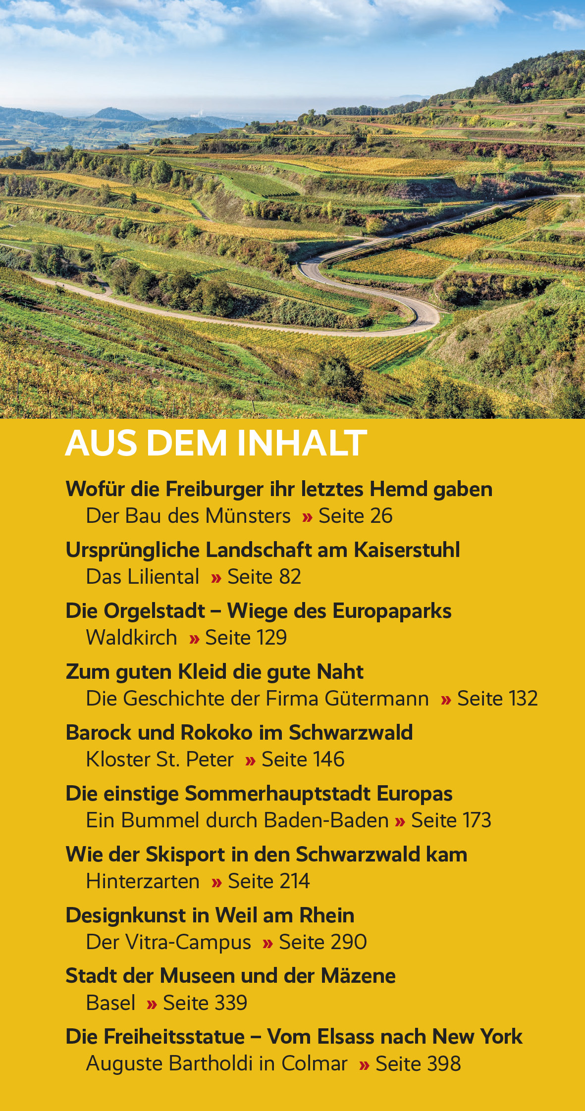 INHALTSVERZEICHNIS Vorwort 13 Ein Tagesausflug nach Freiburg Tour 1 (1 Tag) 14 Durch die Eisenbahnstraße zum Rathausplatz 14 Rund um den Rathausplatz 16 Haus zum Walfisch 19 Kaiser-Joseph-Straße, Basler Hof und Siegesdenkmal 20 Rundgang ums Münster 22 Das Innere des Münsters 28 Münsterplatz 31 Von der Schusterstraße nach Oberlinden 36 Schlossberg 40 Über die Salzstraße zum Martinstor 41 Gerberau und Fischerau 43 Vom Martinstor zum Platz der Alten Synagoge 46 Außerhalb der Altstadt 50 Große Kaiserstuhlrundfahrt Tour 2 (65 km/12 Tage) 55 Aus der Geschichte 55 Munzingen 55 Breisach 58 Vogtsburg 67 Rund um Endingen 75 Riegel 79 Bötzingen 81 Wasenweiler 82 Liliental 82 Ihringen 83 Merdingen 84 Elz-, Kinzig- und Schuttertal Tour 3 (65 km/12 Tage) 87 Waldkirch-Kollnau 87 Sexau (Obersexau) 87 St. Georg in Bleibach 89 Im Elztal 90 Gutach 94 Haslach im Kinzigtal 96 Zell am Harmersbach 102 Seelbach 104 Schuttertal 105 Freiamt 106 Sexau 109 Breisgau Tour 4 (80 km/12 Tage) 111 Denzlingen 111 Emmendingen 111 Von Hecklingen nach Rheinhausen 114 Von Rust bis Schwanau 116 Meißenheim 117 Mahlberg 120 Ettenheim 120 Von Waldkirch auf die Höhen des Südschwarzwalds Tour 5 (100 km/12 Tage) 127 Suggental 127 Waldkirch 129 Gutach 131 Simonswald 134 Gütenbach 137 Linachtalsperre 138 Furtwangen 139 St. Märgen 143 St. Peter 146 Glottertal 151 Ortenau Tour 6 (85 km/12 Tage) 157 Gengenbach 158 Ortenberg 163 Offenburg 164 Durbach 164 Oberkirch 167 Sasbachwalden 169 Achern 169 Renchen-Ulm 170 Kehl-Goldscheuer 170 In und um Baden-Baden Tour 7 (12 Tage) 173 Rund um Stiftskirche und Neues Schloss 173 Das Kurviertel 178 Die Umgebung von Baden-Baden 184 Gernsbach 187 Die Abteikirche in Schwarzach 189 Rastatt 190 Museumstour im mittleren Schwarzwald Tour 8 (130 km/12 Tage) 192 Triberg 192 Hornberg 197 Von Hornberg nach Hausach und Wolfach 199 Schiltach 200 Schramberg 203 St. Georgen 205 Hochschwarzwald Tour 9 (140 km/12 Tage) 207 Von Freiburg nach Kirchzarten 207 Höllental 208 Hinterzarten 214 Rund um Titisee-Neustadt 219 Schluchsee 220 Menzenschwand 224 Bernau 224 Todtnau 229 Über Oberried nach Freiburg 233 Über den Schauinsland nach Freiburg 235 Nördliches Markgräflerland und Münstertal Tour 10 (90 km/2 Tage) 243 Aus der Geschichte 243 Freiburg/Merzhausen 244 Das Hexental 246 St. Ulrich 247 Bollschweil 249 Staufen 251 Münstertal 257 Badenweiler 262 Müllheim 271 Sulzburg/Laufen 272 Sulzburg 274 Heitersheim 278 Bad Krozingen 279 Südliches Markgräflerland Tour 11 (110 km/1-3 Tage) 285 Ein Abstecher ins Elsass 285 Blansingen 287 Istein 289 Weil am Rhein 290 Ötlingen 294 Kandern/Malsburg 295 Schloss Bürgeln 300 Mauchen 302 Hertingen/Ettenbühl 303 Wiesental und Hotzenwald Tour 12 (140 km/13 Tage) 305 Lörrach 305 Inzlingen 308 Rund um Rheinfelden 308 Bad Säckingen 314 Laufenburg 318 Hotzenwald 320 Wiesental 332 In und um Basel Tour 13 (13 Tage) 339 Basel Liebe auf den zweiten Blick 339 Anfahrt 340 Vom Schweizer Bahnhof zur St. Alban-Vorstadt 341 Basler Münster 350 Vom Münsterplatz zur mittleren Rheinbrücke 352 Kleinbasel 354 Marktplatz 356 Vom Marktplatz zur Peterskirche 358 Spalenvorstadt und Spalenberg 359 Leonhardskirchplatz und Gerbergässlein 363 Barfüsserplatz 365 Rund um das Stadttheater 365 Was es sonst noch gibt 366 Kunst- und Gaumenfreude im mittleren Elsass Tour 14 (135 km/2 Tage) 375 Am Rhein entlang 375 Ebersmünster 376 Dambach-la-ville 378 Sélestat 379 Kintzheim 384 Haut-Koenigsbourg 385 Bergheim 386 Ribeauvillé 387 Kulinarische Einkehr 388 Hunawihr 388 Riquewihr 390 Kaysersberg 390 Colmar 392 Rund um Neuf-Brisach 400 Eine Fahrt ins südliche Elsass und in die Vogesen Tour 15 (175 km/24 Tage) 403 Eguisheim 403 Gueberschwihr 405 Florival Lauchtal 406 Soultz und Ungersheim 409 Mulhouse 409 Route des Crêtes 413 Das Munstertal 416 Turkheim 417 ANHANG Register 421 Danksagung 426 Kartenregister 428 Bildnachweis 428 Kartenlegende 432 Zeichenlegende 432 EXTRA Die Firma Welte & Söhne 17 Der Bau des Münsters 26 Das Leben des Johann Christian Wentzinger 35 Die Freiburger Bächle 39 Warum Amerika nicht Columbia heißt 47 Der Rheinausbau 64 Die Traber-Truppe 66 Lazarus von Schwendi und der Ruländer 71 Der Brautbrunnen 75 Die Fasnet in Elzach 92 Hemingway im Elztal 94 Über den Schwarzwälder Bollenhut 97 Hansjakob 101 Was Teningen mit dem Guggenheim-Museum zu tun hat 113 Goethe und seine Liebelei 119 Der berühmt-berüchtigte Kardinal und die Halsbandaffäre 123 Waldkircher Industrie 130 Die Firma Sick 130 Orgelstadt Waldkirch 130 Granatschleiferei 130 Die Geschichte der Firma Gütermann 132 Warum die Kuckucksuhr nicht Hahnenuhr heißt 141 Von der Schwarzwälder Kirschtorte 146 Die Flößerei im Schwarzwald 162 Der Türkenlouis 176 Die Sommerhauptstadt Europas 181 Hemingway und Triberg 195 Die Firma Junghans 204 Die Geschichte der Höllentalbahn 212 Die Schwarzwald-Maler 218 Der Rothaus-Mythos 223 Wie der Maler Winterhalter aus Menzenschwand die Welt eroberte 225 Hans Thoma 228 Der Todtnauer Erfinder der Dauerwelle 232 Biosphärengebiet Hochschwarzwald 242 Was das Schloss in Bollschweil mit Kaspar Hauser zu tun hat 250 Faust in Staufen 251 Das Gefecht von Staufen 256 Der Spielweg eine Institution 261 Dr. Fraenkel und Hermann Hesse 265 Badenweiler und seine Künstler 267 Tschechow in Badenweiler 270 Die Geschichte von St. Cyriak 276 Wie die Malteser in den Breisgau kamen 283 Johann August Sutter der Kaiser von Kalifornien 296 Zur Geschichte des Einweckens 313 Fürstabt Martin Gebert und sein Dom 331 Der Badische Bahnhof 341 Was Gewerbe mit Humanismus zu tun hat 349 Basler Lied 352 Hans Holbein 360 Ernst Beyeler 368 Die Rückkehr der Störche 389 Auguste Bartholdi und die Freiheitsstatue 398 Die Geschichte der Schlümpfe 412 Der Belchenmythos 415 >>> Weitere Reiseführer zu interessanten Regionen in Deutschland finden Sie auf der Website des Trescher Verlags.