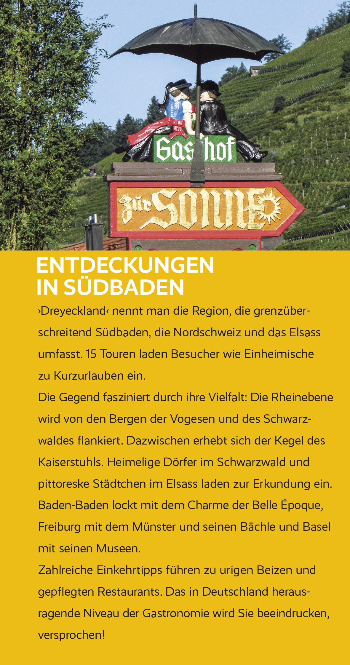 Dreyeckland nennt man die Region, die grenzüberschreitend Südbaden, die Nordschweiz und das Elsass umfasst. Die Gegend fasziniert durch ihre Vielfalt: Die Rheinebene wird von den Bergen der Vogesen und des Schwarzwaldes flankiert. Dazwischen erhebt sich der Ke...Dreyeckland nennt man die Region, die grenzüberschreitend Südbaden, die Nordschweiz und das Elsass umfasst. Die Gegend fasziniert durch ihre Vielfalt: Die Rheinebene wird von den Bergen der Vogesen und des Schwarzwaldes flankiert. Dazwischen erhebt sich der Kegel des Kaiserstuhls. Heimelige Dörfer im Schwarzwald und pittoreske Städtchen im Elsass laden zur Erkundung ein. Baden-Baden lockt mit dem Charme der Belle Époque, Freiburg mit dem Münster und seinen Bächle und Basel mit seinen Museen. Dieser Reiseführer lädt mit 15 Ein-und Mehrtagestouren Besucher wie Einheimische zu Kurzurlauben ein. Mehr als 230 persönliche Einkehrtipps des Autors führen zu urigen Beizen und gepflegten Restaurants. Auch an ansprechenden Übernachtungstipps ist kein Mangel. Die interessante Geschichte und Gegenwart der Region wird in zahlreichen kurzweiligen Texten gewürdigt. >>> Weitere Reiseführer zu interessanten Regionen in Deutschland finden Sie auf der Website des Trescher Verlags.