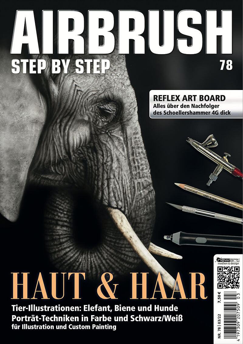 Airbrush Step by Step 78: Haut & Haar Step by Steps: Elefanten-Porträt von Xavier Gentilleau Bienen-Illustration von Tony Dee Frau mit Hund: Porträt von Adriano Ayerbe Porträt eines alten Mannes von Mario Romani Helm-Design mit Robbie Williams Porträt von ...