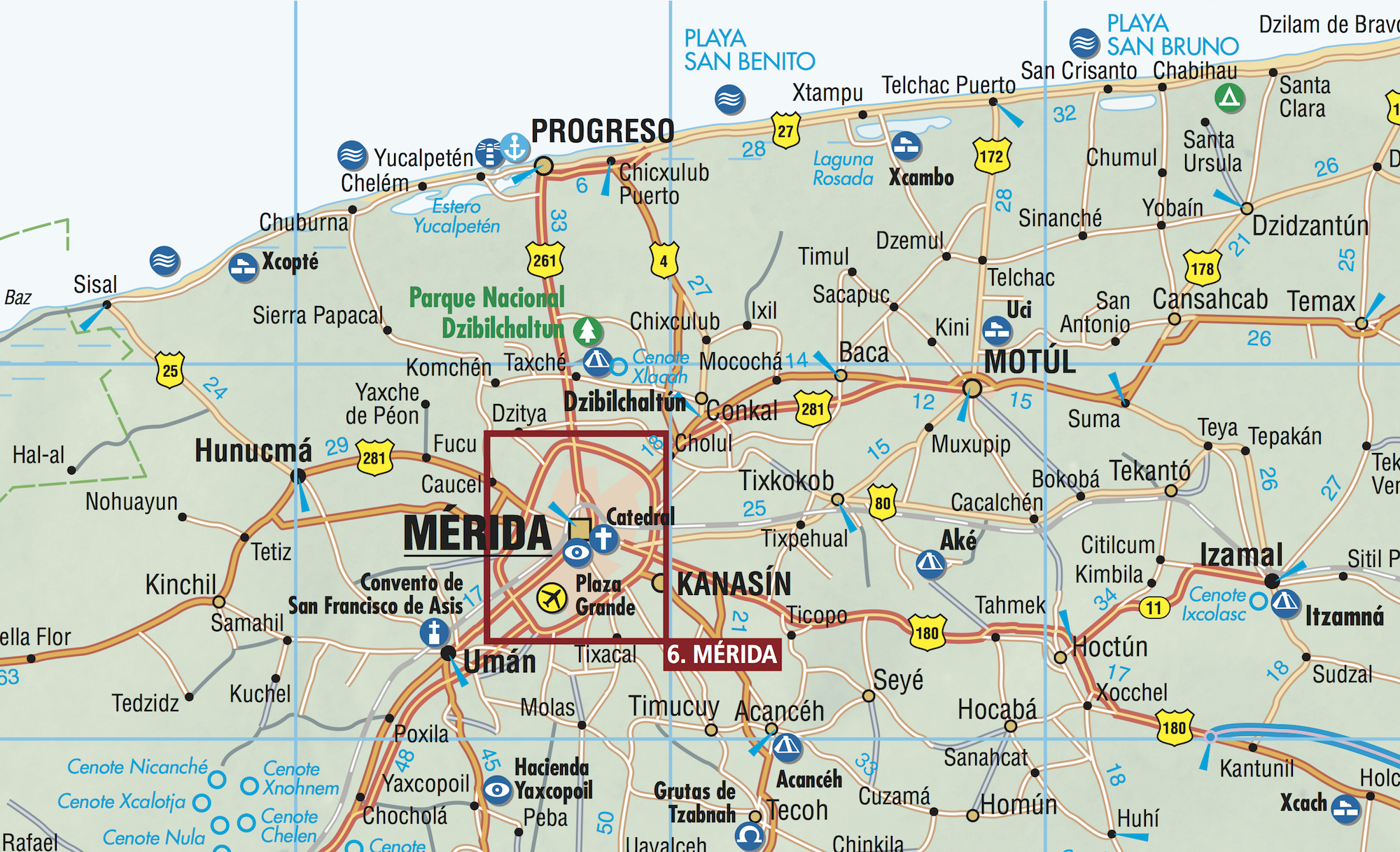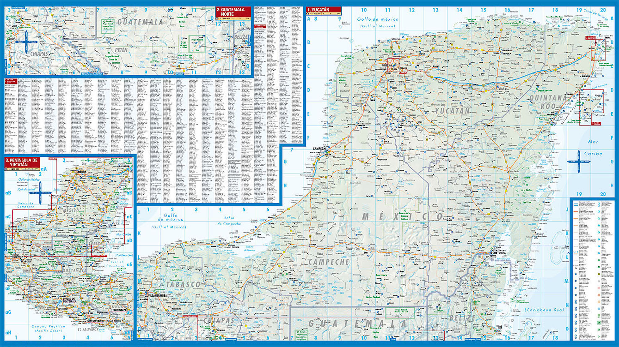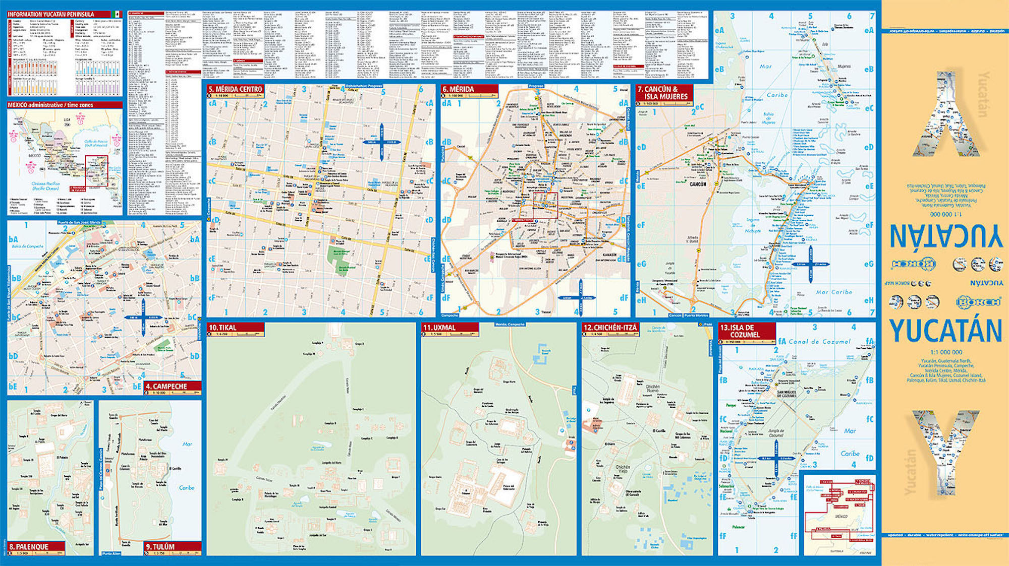 Our laminated and folded Borch Map of Yucatan in the 9th edition contains: Yucatán 1:1 000 000, Guatemala North 1:1 000 000, Yucatán Peninsula 1:4 000 000, Campeche 1:10 000, Mérida Centre 1:10 000, Mérida 1:100 000, Cancún & Isla Mujeres 1:100 000, Palenq...