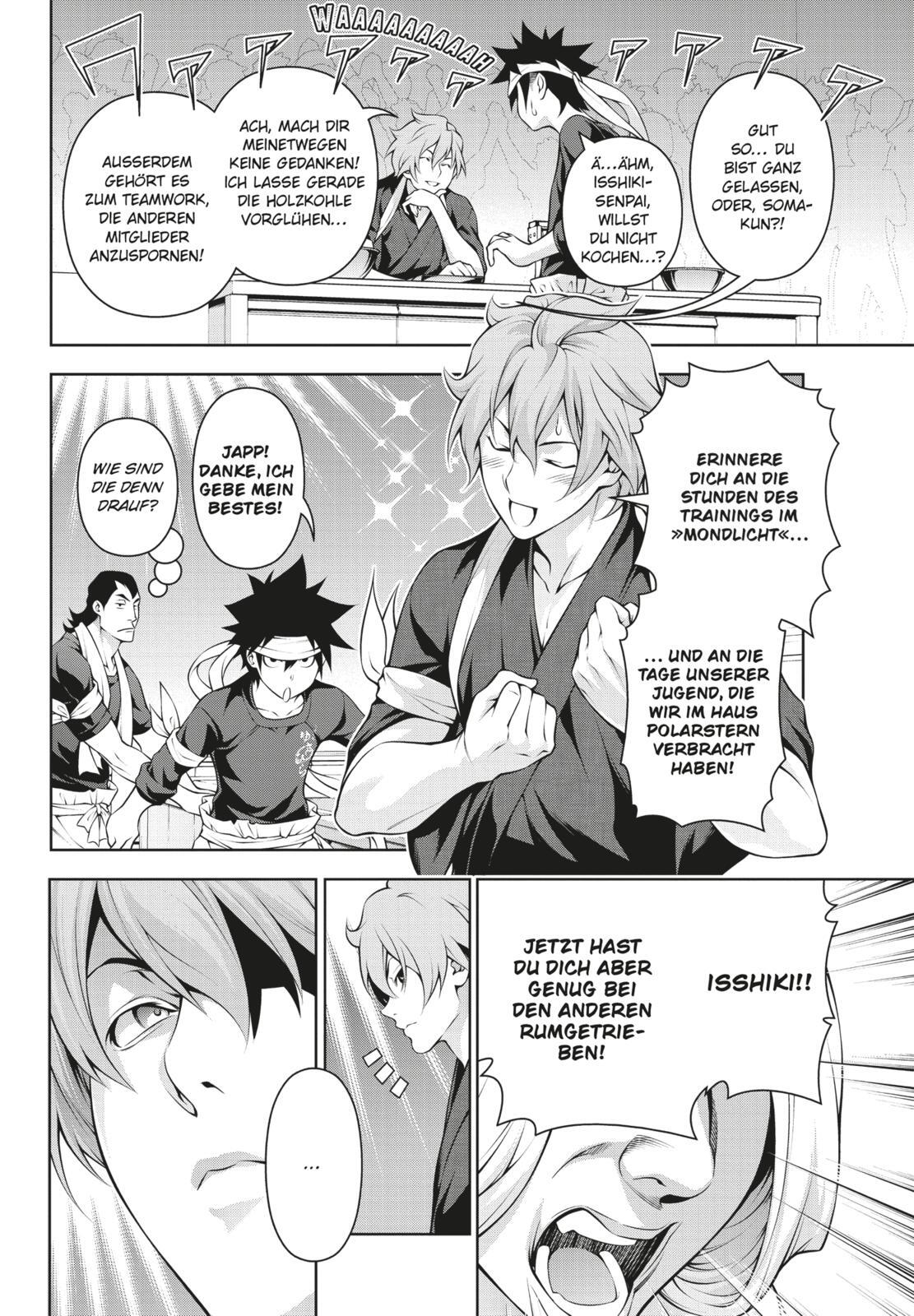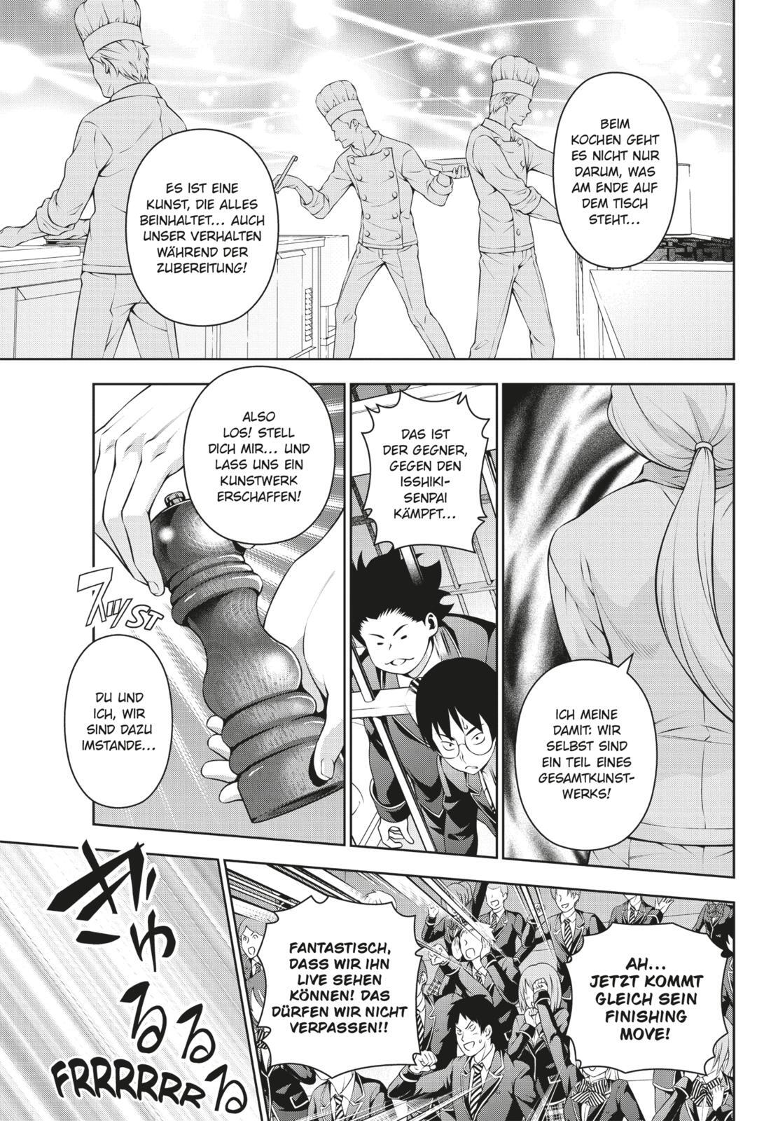 Der Leckerbissen für alle Sinne! Eine Extraportion Humor garniert mit pikanter Action! Endlich beginnt das »Régiment de cuisine«! Als Erste treten Soma, Isshiki und Megishima in den Ring, um für ihre besiegten Freunde zu kämpfen! Glückspilz (?) Soma zieht das...