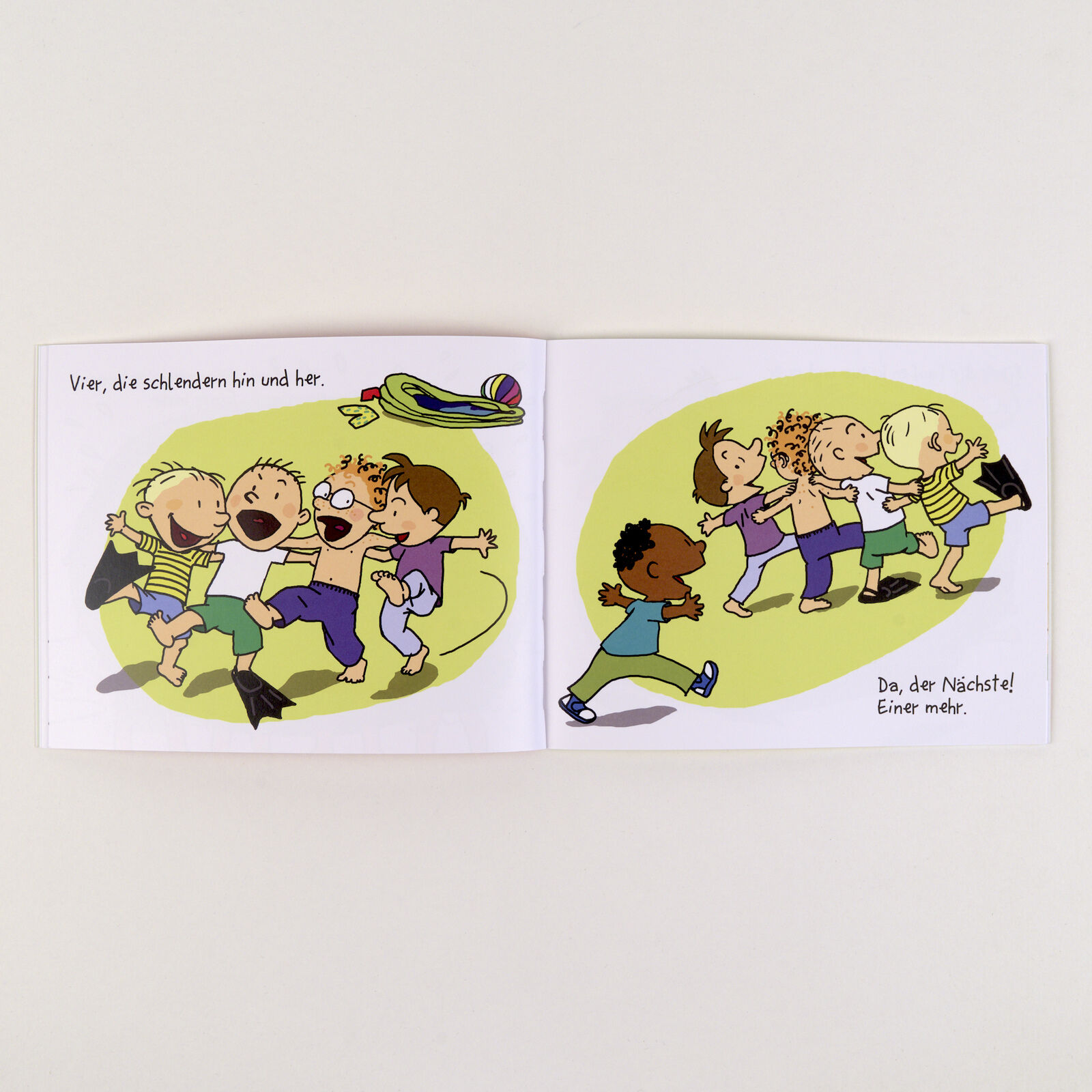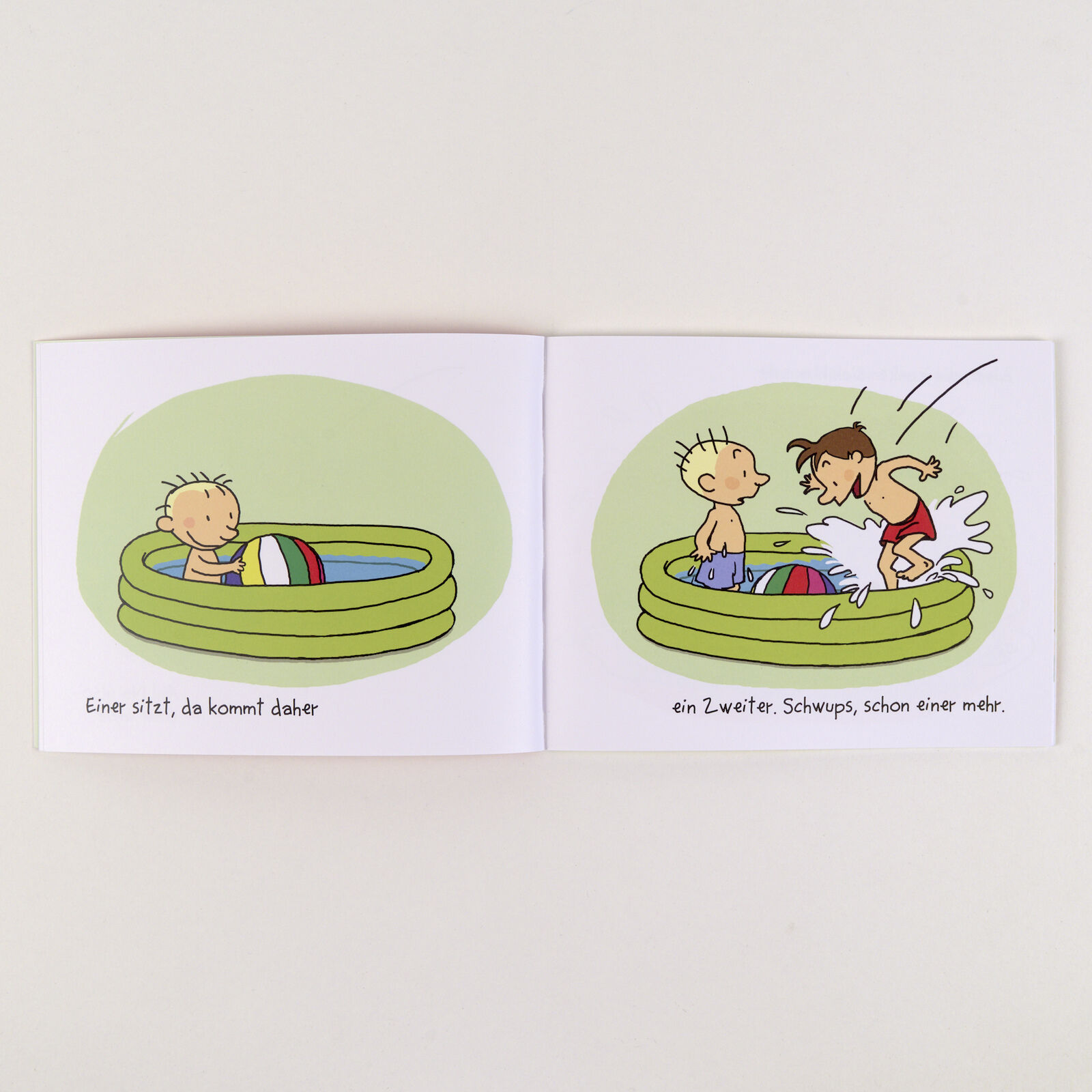 Viele Jungen treiben hier ihre Späße und Seite für Seite wird es einer mehr. Übermütig machen sie all das, was ihnen einfällt: Sie plantschen und streiten, rennen und buddeln, jammern, kleckern und speisen und schlafen am Ende ganz friedlich nebeneinander ein....