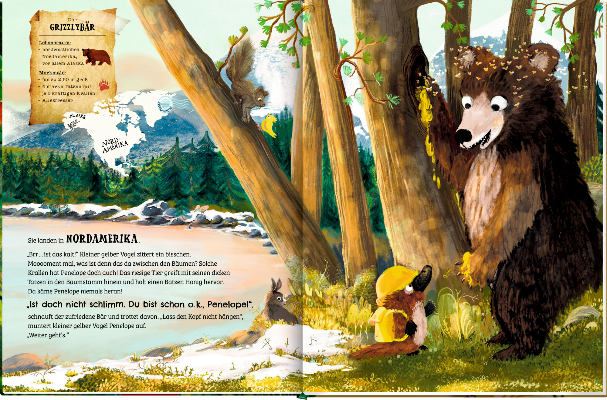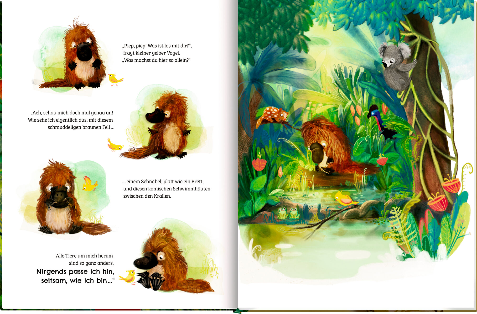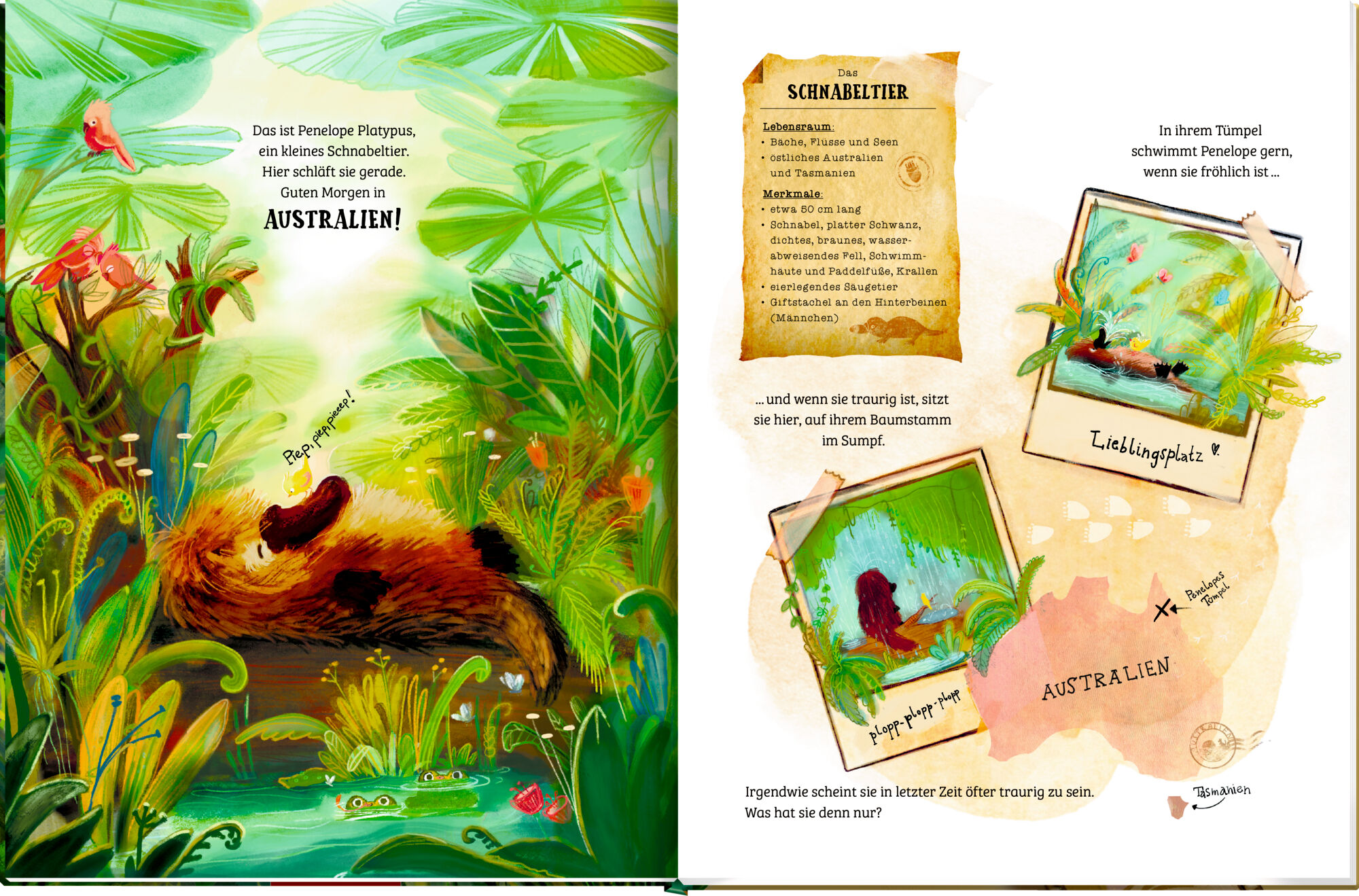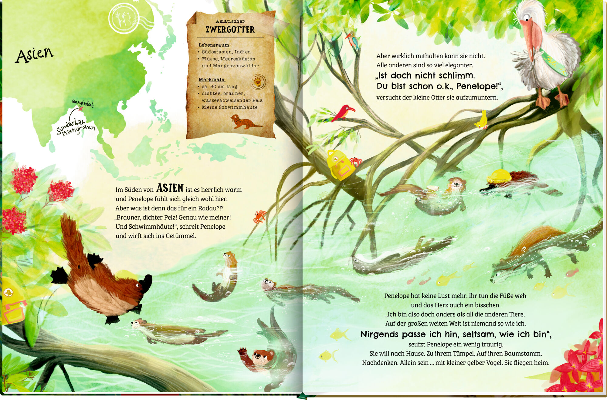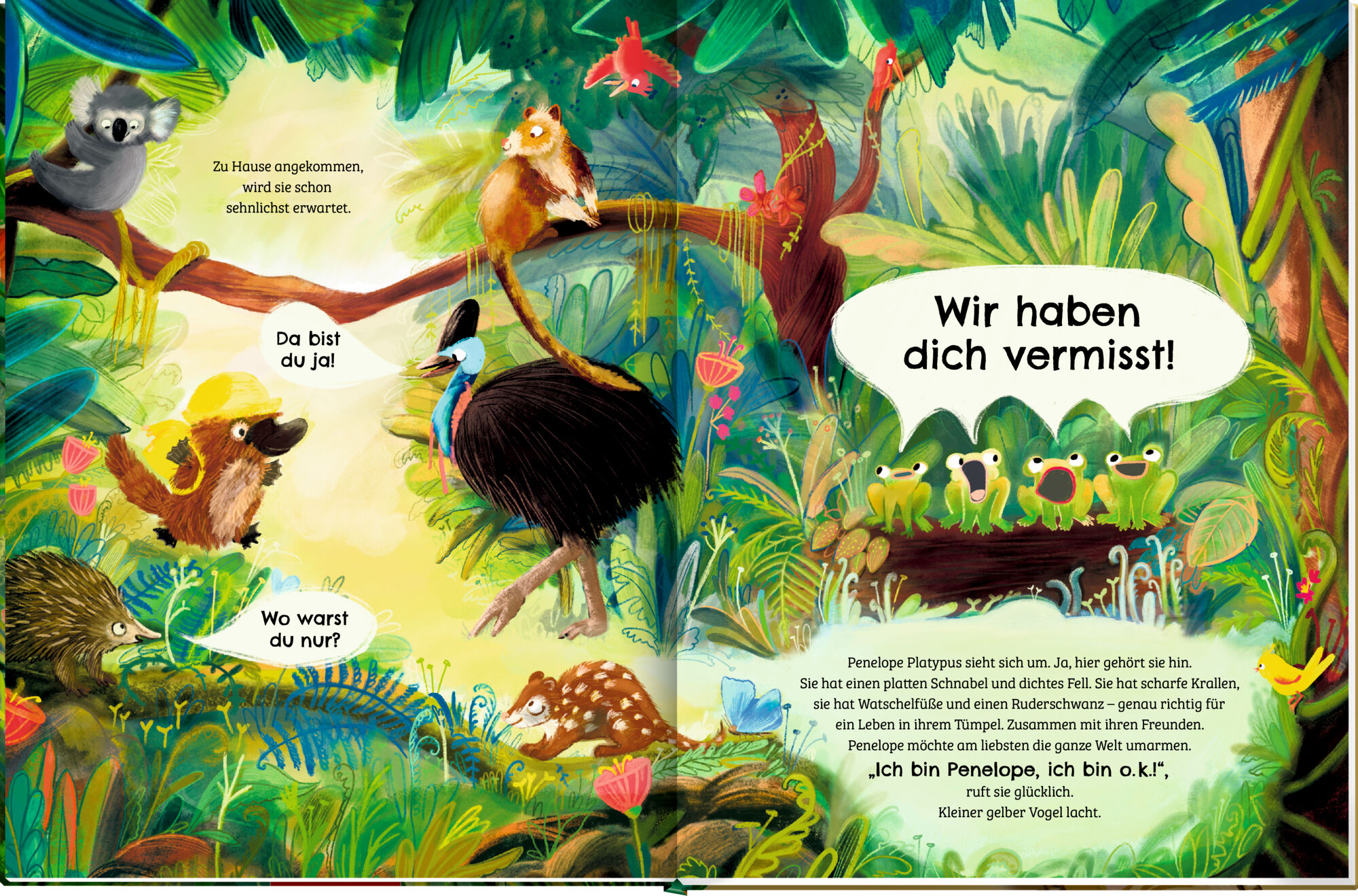 Penelope ist anders als die anderen Tiere. Sie hat ein dickes, schmuddeliges Fell, einen Schnabel, platt wie ein Brett, komische Watschelfüße mit scharfen Krallen und einen buschigen Schwanz. Sie kann nicht auf dem Wasser landen wie eine Gans, Honig schlecken...