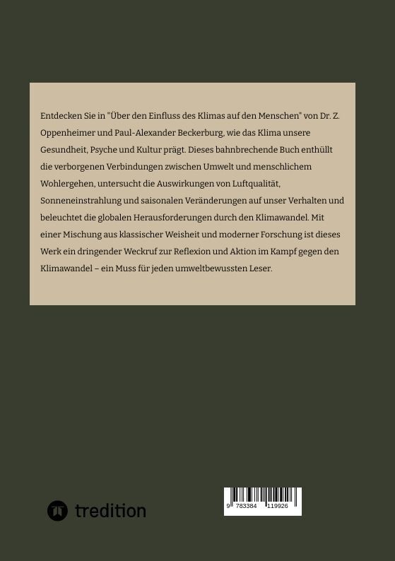 Entdecken Sie in "Über den Einfluss des Klimas auf den Menschen" von Dr. Z. Oppenheimer und Paul-Alexander Beckerburg, wie das Klima unsere Gesundheit, Psyche und Kultur prägt. Dieses bahnbrechende Buch enthüllt die verborgenen Verbindungen zwischen Umwelt und...