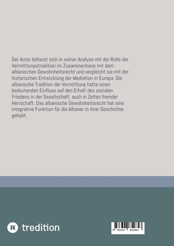 Der Autor befasst sich in seiner Analyse mit der Rolle der Vermittlungstradition im Zusammenhang mit dem albanischen Gewohnheitsrecht und vergleicht sie mit der historischen Entwicklung der Mediation in Europa. Die albanische Tradition der Vermittlung hatte ei...
