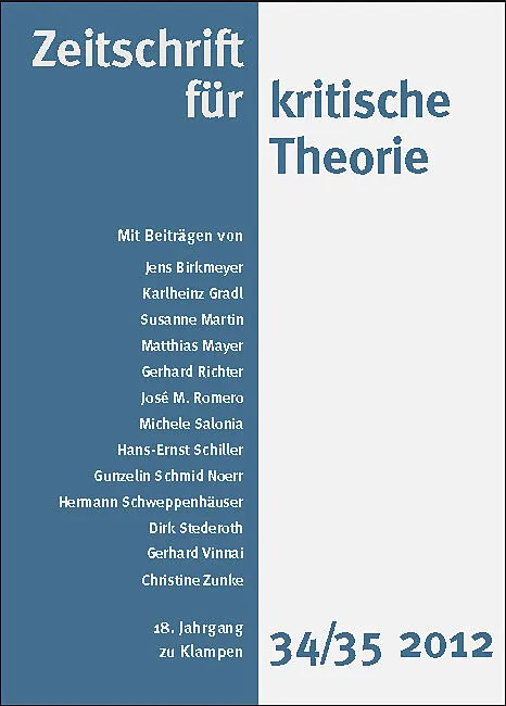 Ankündigung: Nach bald 20-jährigem Erscheinen werden erstmals die Abonnement- und Einzelpreise der Zeitschrift für kritische Theorie ab dem nächsten Doppelheft, dem Jahrgang 19, ET Herbst 2013, auf 28 mit Abo bzw. 32 ohne Abo erhöht. Inhalt Vorbemerkung der Redaktion Hermann Schweppenhäuser: Schein, Bild, Ausdruck. Aspekte der Adorno'schen Theorie der Kunst und des Kunstwerks Matthias Mayer: Aktualität und Kritik marxistischer Ethik José M. Romero: Ontologie und Geschichtlichkeit beim jungen Marcuse Dirk Stederoth: Kulturindustrie und Musik. Willkommen im 'Haus of Gaga' Michele Salonia: Die Verschlingung von Mode und Kulturindustrie Jens Birkmeyer: Augen-blicke und Einbildungen. Kritik der Achtsamkeit in Walter Benjamins Berliner Kindheit um neunzehnhundert Gerhard Vinnai: Wunschwelten und kritische Gesellschaftstheorie Christine Zunke: Es ist nicht alles Schein, was trügt. Die Hirnforschung zwischen Erkentnisfortschritt und Ideologieproduktion Hans-Ernst Schiller: Die kritische Theorie als historische Formation Gunzelin Schmid Noerr: Die Materialität der Vernunft. Kann man heute noch kritische Theorie betreiben? Gerhard Richter: Gespräch über Bäume Karlheinz Gradl: Adorno und das Erhabene Susanne Martin: Intellektuellenportraits. Zur kulturindustriellen Darstellung von Intellektualität und wissenschaftlicher Arbeit Besprechung: Dennis Johannßen: Jenseits von Aura und Erlebnis. Zu vier aktuellen Beiträgen der US-amerikanischen Walter-Benjamin-Forschung