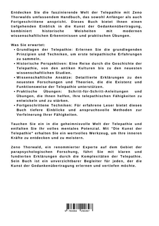 Entdecken Sie die faszinierende Welt der Telepathie mit Zeno Thorwalds umfassendem Handbuch, das sowohl Anfänger als auch Fortgeschrittene anspricht. Dieses Buch bietet Ihnen einen tiefgehenden Einblick in die Kunst der Gedankenübertragung, kombiniert historis...