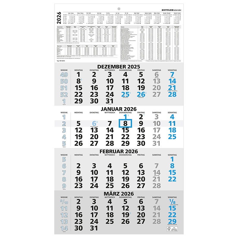 Der Zettler 4-Monatskalender blau 2026 bietet Ihnen immer vier Monate auf einen Blick perfekt für die langfristige Planung im Büro oder Homeoffice. Mit Jahresübersicht, Ferienterminen und Datumsschieber behalten Sie stets die Übersicht. Kalendertyp: ...